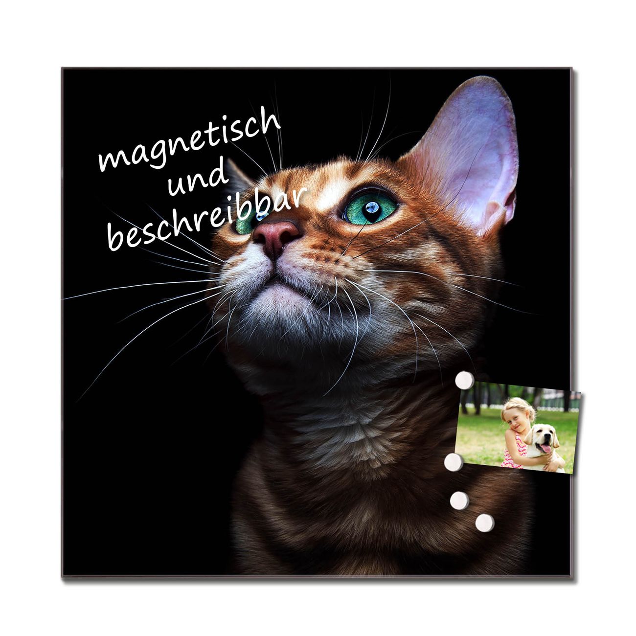 Das Glasbild besteht aus 4mm gehärtetem zertifiziertem ESG Sicherheitsglas, die Rückwand aus einem magnetischen Stahlblech. Durch die superflache Bauweise haben Sie die Wahl aus einer Vielzahl von Befestigungsmöglichkeiten. Sie können das Wandbild mit einem Montagekleber superflach an die Wand kleben oder Sie wählen eines unserer passenden Befestigungssets, welches eine optimale Montage garantiert. Durch die mitgelieferten 4 Neodym-Magnete ist Ihr Glaswandbild sofort einsatzbereit. Wir sind ein kleines Team aus dem Herzen von Sachsen und fertigen alle Artikel von Hand für Sie an. Wir entwerfen unsere Produkte selbst mit großer Liebe zum Detail.