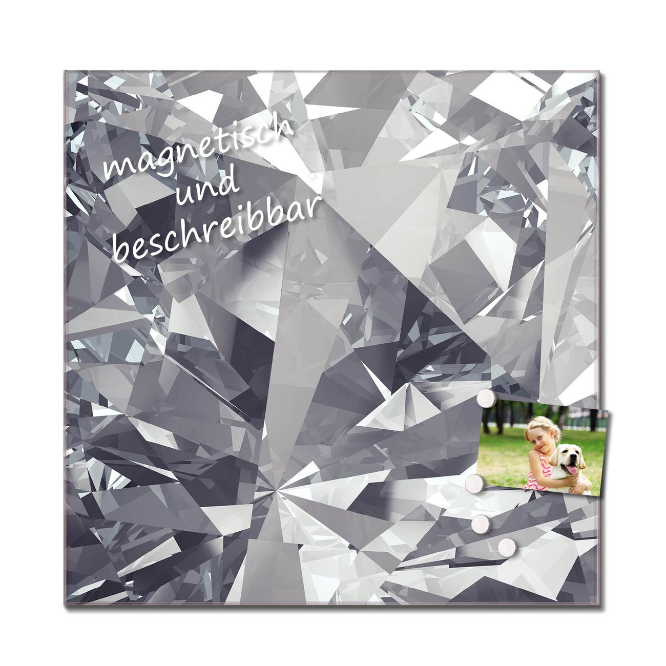 Das Glasbild besteht aus 4mm gehärtetem zertifiziertem ESG Sicherheitsglas, die Rückwand aus einem magnetischen Stahlblech. Durch die superflache Bauweise haben Sie die Wahl aus einer Vielzahl von Befestigungsmöglichkeiten. Sie können das Wandbild mit einem Montagekleber superflach an die Wand kleben oder Sie wählen eines unserer passenden Befestigungssets, welches eine optimale Montage garantiert. Durch die mitgelieferten 4 Neodym-Magnete ist Ihr Glaswandbild sofort einsatzbereit. Wir sind ein kleines Team aus dem Herzen von Sachsen und fertigen alle Artikel von Hand für Sie an. Wir entwerfen unsere Produkte selbst mit großer Liebe zum Detail.