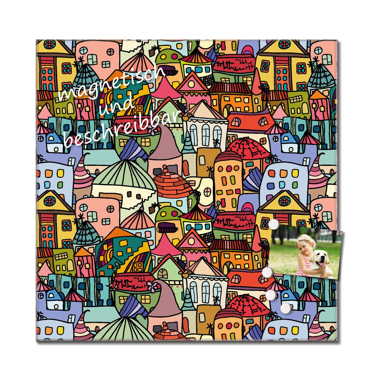 Das Glasbild besteht aus 4mm gehärtetem zertifiziertem ESG Sicherheitsglas, die Rückwand aus einem magnetischen Stahlblech. Durch die superflache Bauweise haben Sie die Wahl aus einer Vielzahl von Befestigungsmöglichkeiten. Sie können das Wandbild mit einem Montagekleber superflach an die Wand kleben oder Sie wählen eines unserer passenden Befestigungssets, welches eine optimale Montage garantiert. Durch die mitgelieferten 4 Neodym-Magnete ist Ihr Glaswandbild sofort einsatzbereit. Wir sind ein kleines Team aus dem Herzen von Sachsen und fertigen alle Artikel von Hand für Sie an. Wir entwerfen unsere Produkte selbst mit großer Liebe zum Detail.