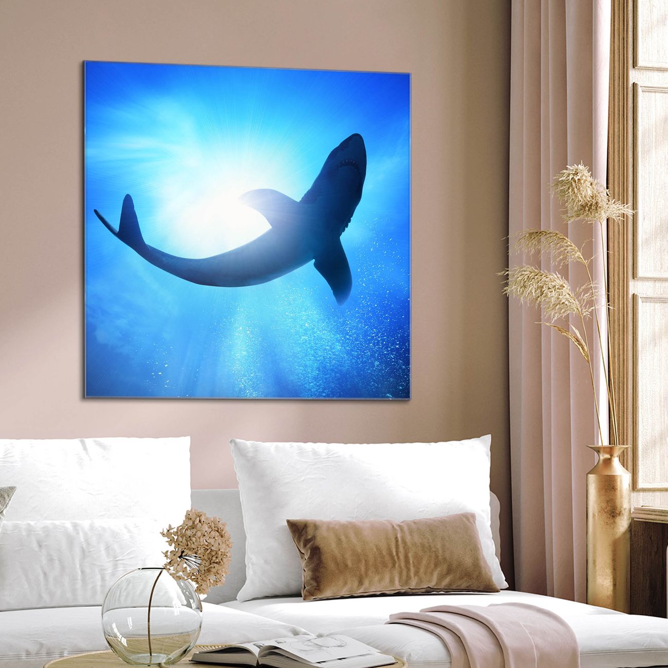 Unsere einzigartigen Glasbilder im Querformat von banjado mit Motiv Hai sind der absolute Hingucker! Unsere Banjado Glasbilder sind sehr begehrt, weil sie top verarbeitet sind und sich ganz leicht montieren lassen. Schon mit wenigen Handgriffen hängen sie an der Wand und strahlen mit höchster brillianz. Durch die Ramenlose Herstellung schwebt das Echtglasbild förmlich an der Wand. Das Motiv erscheint besonders ausdrucksstark und hochwertig und ist hinter dem Echtglas geschützt.