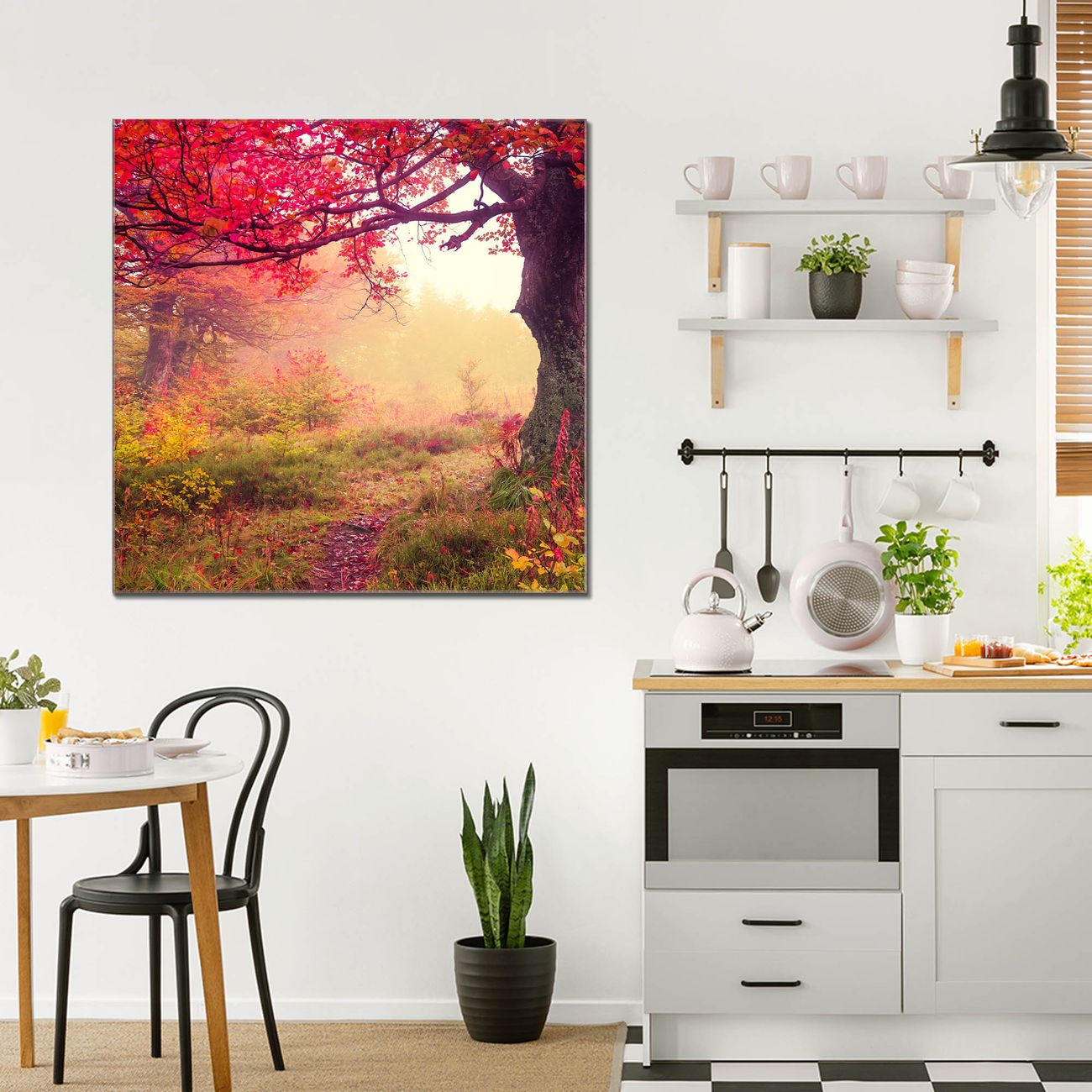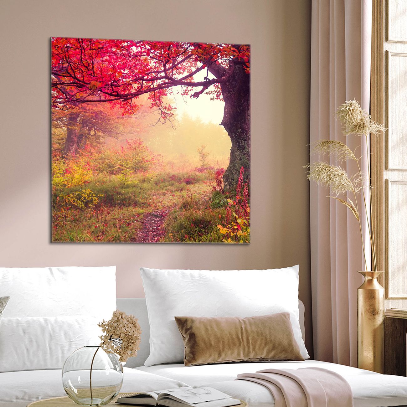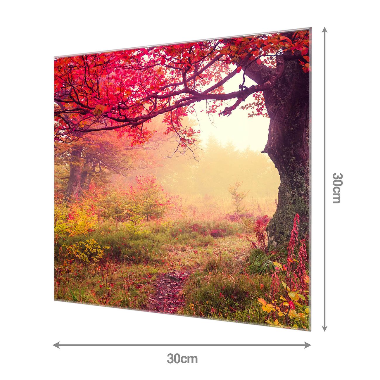 Quadratisches Wandbild aus Glas Lichtung Im Herbst