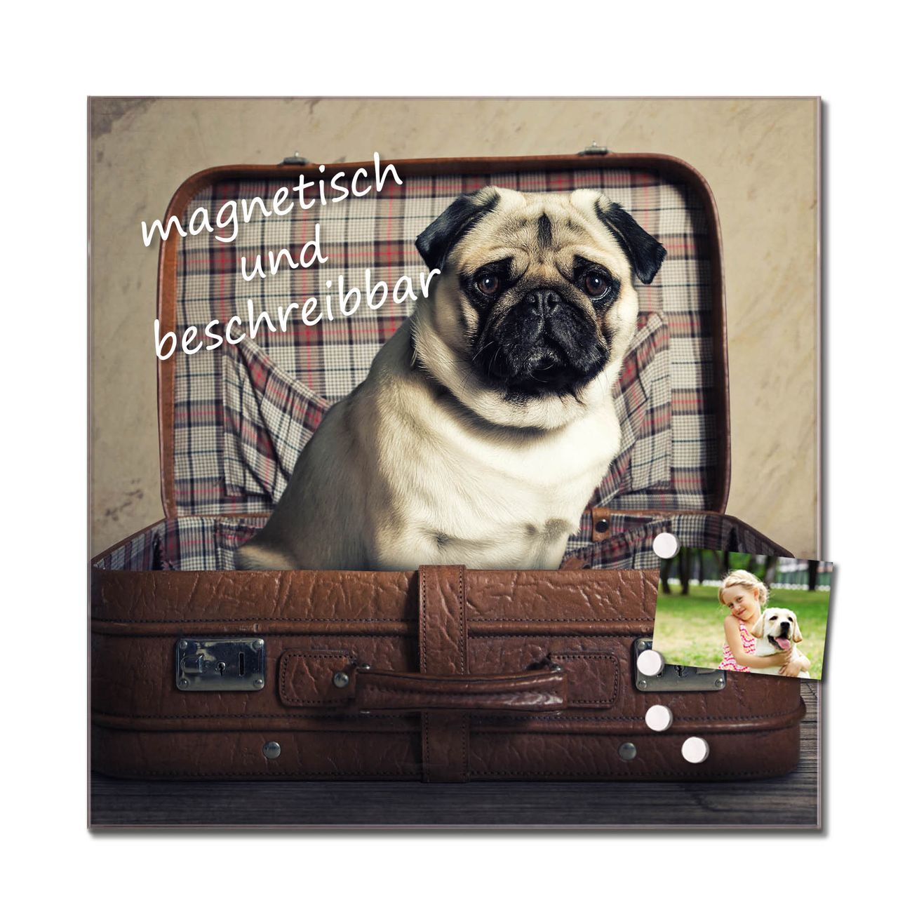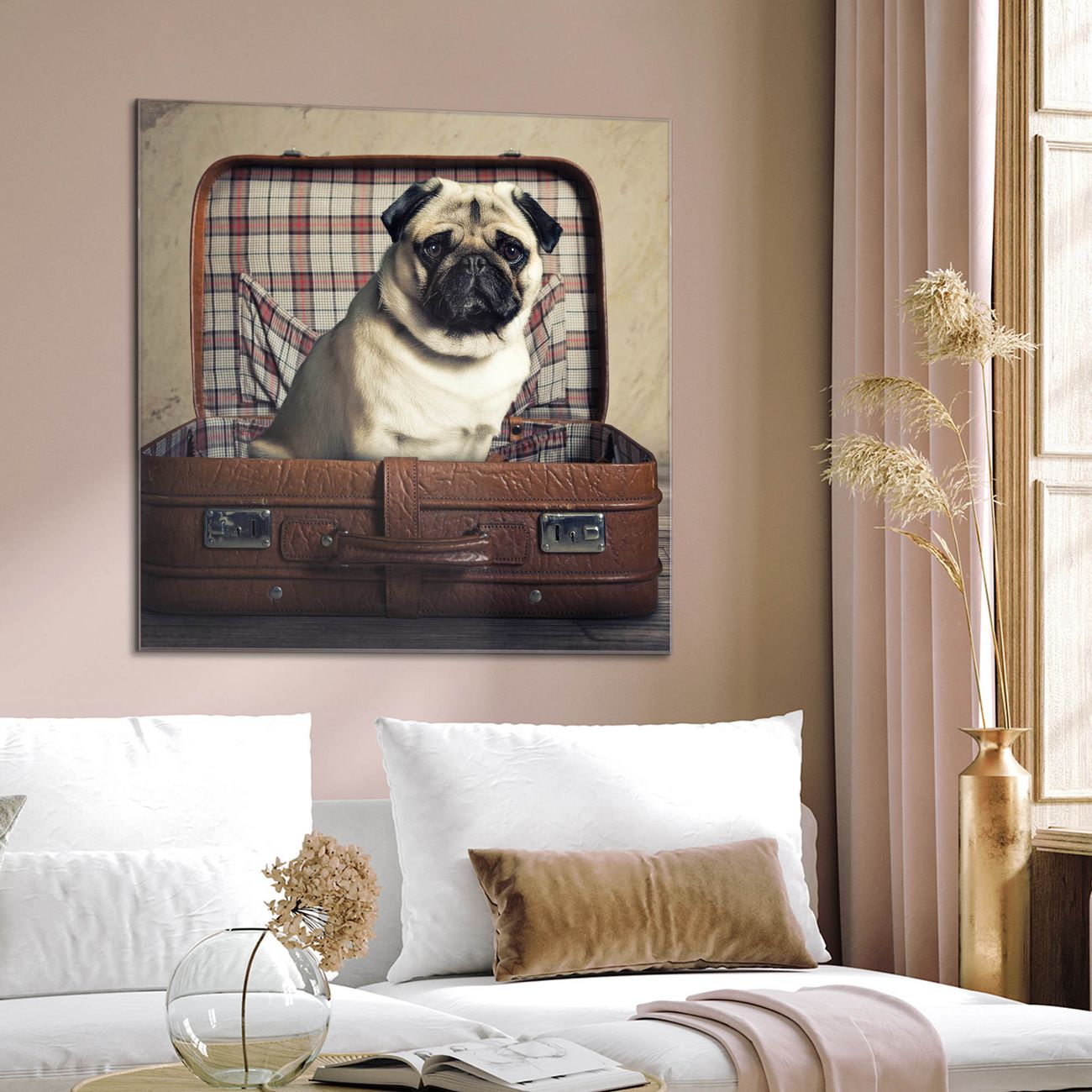 Quadratisches Wandbild aus Glas Mops im Koffer