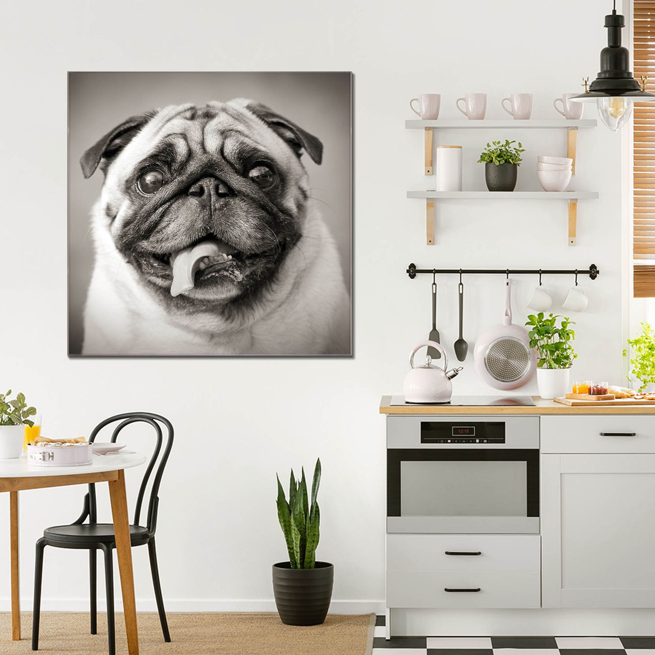 Unsere einzigartigen Glasbilder im Querformat von banjado mit Motiv Mops Porträt sind der absolute Hingucker! Unsere Banjado Glasbilder sind sehr begehrt, weil sie top verarbeitet sind und sich ganz leicht montieren lassen. Schon mit wenigen Handgriffen hängen sie an der Wand und strahlen mit höchster brillianz. Durch die Ramenlose Herstellung schwebt das Echtglasbild förmlich an der Wand. Das Motiv erscheint besonders ausdrucksstark und hochwertig und ist hinter dem Echtglas geschützt.