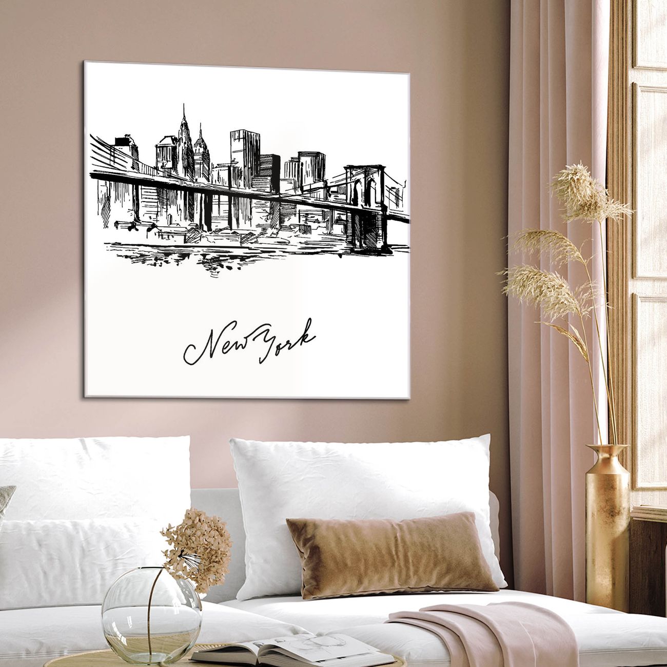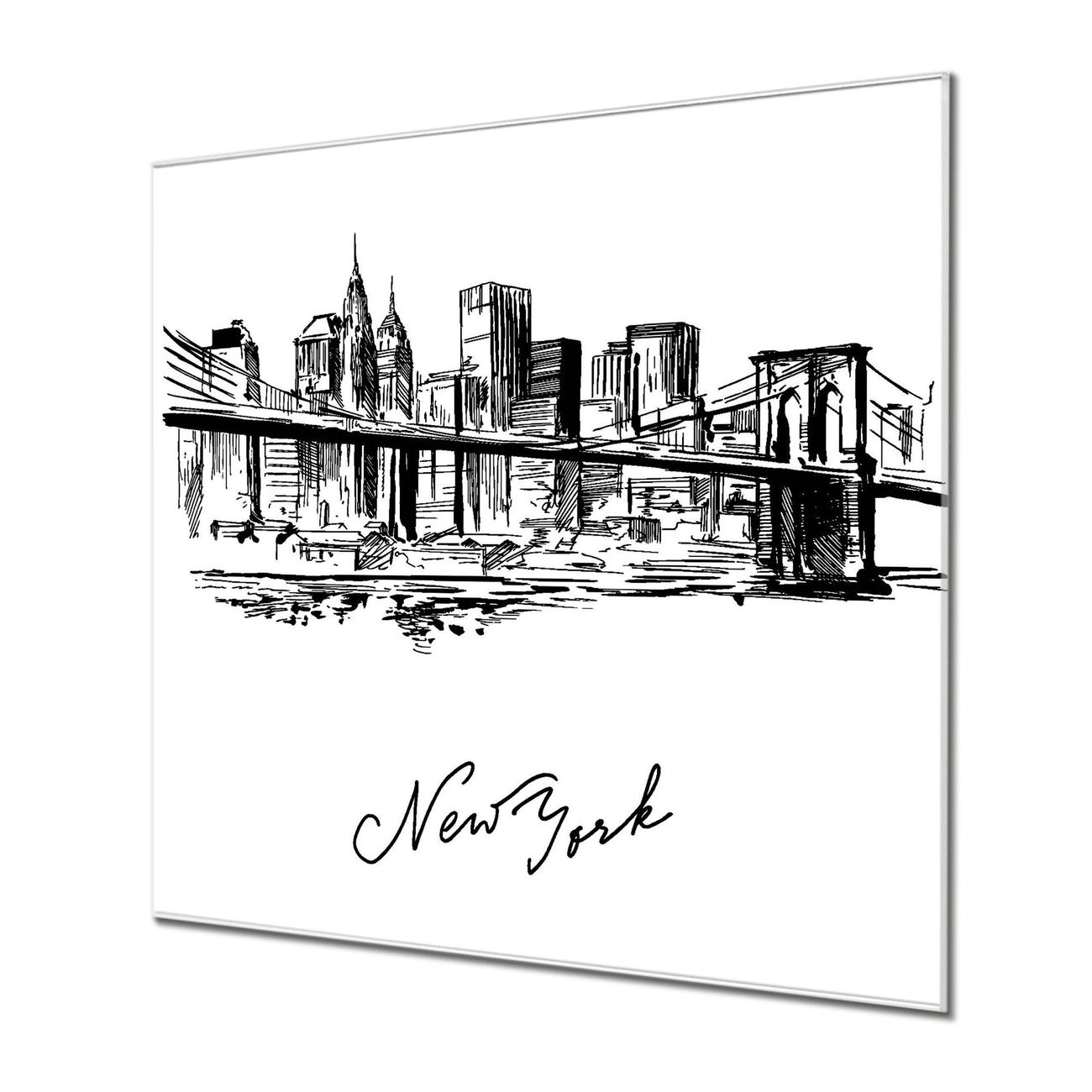 Unsere einzigartigen Glasbilder im Querformat von banjado mit Motiv New York Skizze sind der absolute Hingucker! Unsere Banjado Glasbilder sind sehr begehrt, weil sie top verarbeitet sind und sich ganz leicht montieren lassen. Schon mit wenigen Handgriffen hängen sie an der Wand und strahlen mit höchster brillianz. Durch die Ramenlose Herstellung schwebt das Echtglasbild förmlich an der Wand. Das Motiv erscheint besonders ausdrucksstark und hochwertig und ist hinter dem Echtglas geschützt.