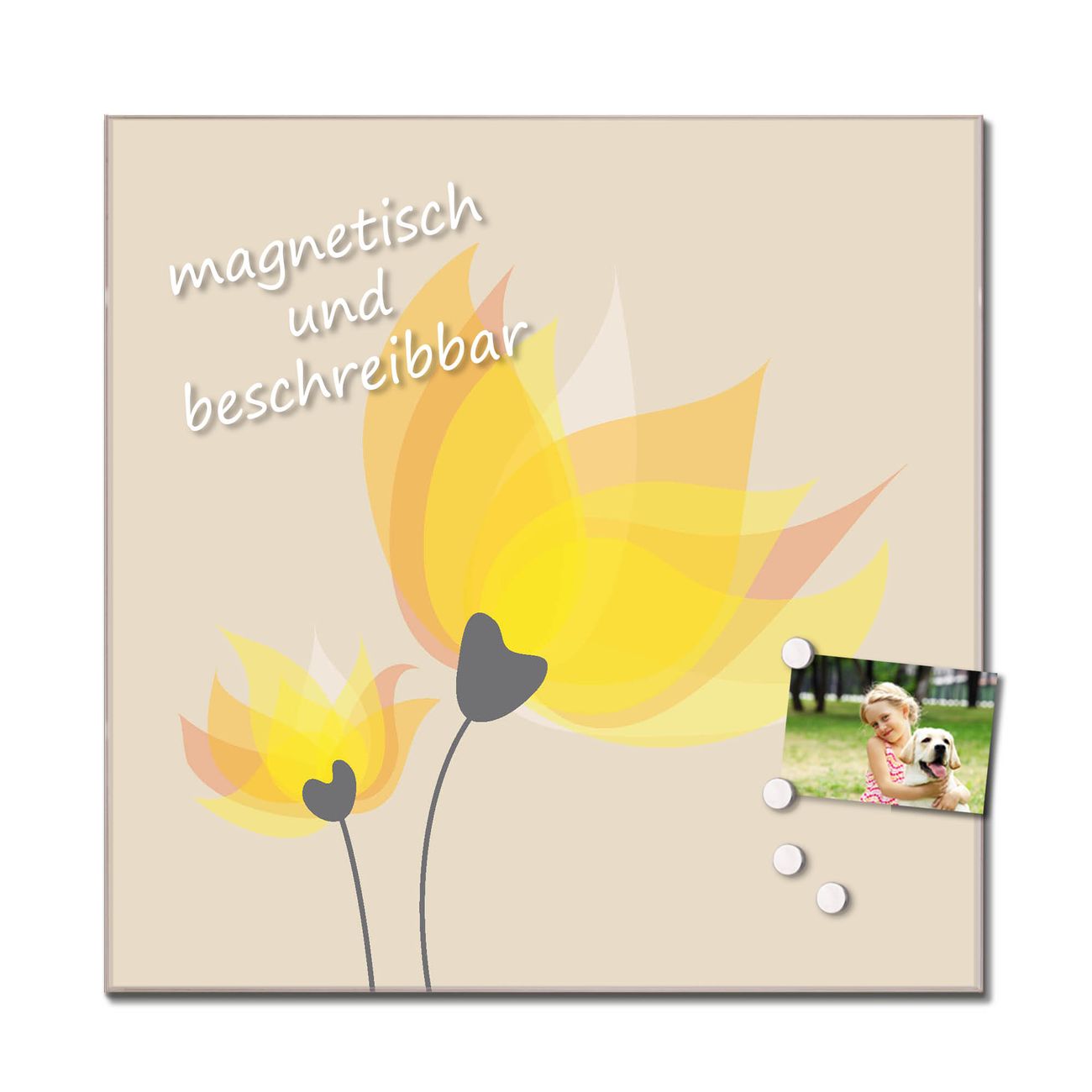 Das Glasbild besteht aus 4mm gehärtetem zertifiziertem ESG Sicherheitsglas, die Rückwand aus einem magnetischen Stahlblech. Durch die superflache Bauweise haben Sie die Wahl aus einer Vielzahl von Befestigungsmöglichkeiten. Sie können das Wandbild mit einem Montagekleber superflach an die Wand kleben oder Sie wählen eines unserer passenden Befestigungssets, welches eine optimale Montage garantiert. Durch die mitgelieferten 4 Neodym-Magnete ist Ihr Glaswandbild sofort einsatzbereit. Wir sind ein kleines Team aus dem Herzen von Sachsen und fertigen alle Artikel von Hand für Sie an. Wir entwerfen unsere Produkte selbst mit großer Liebe zum Detail.