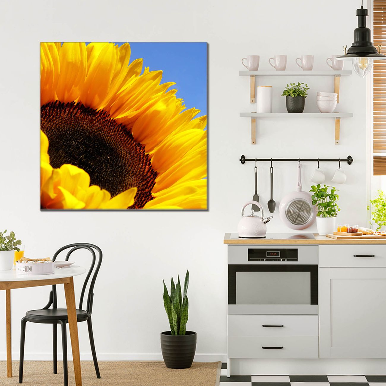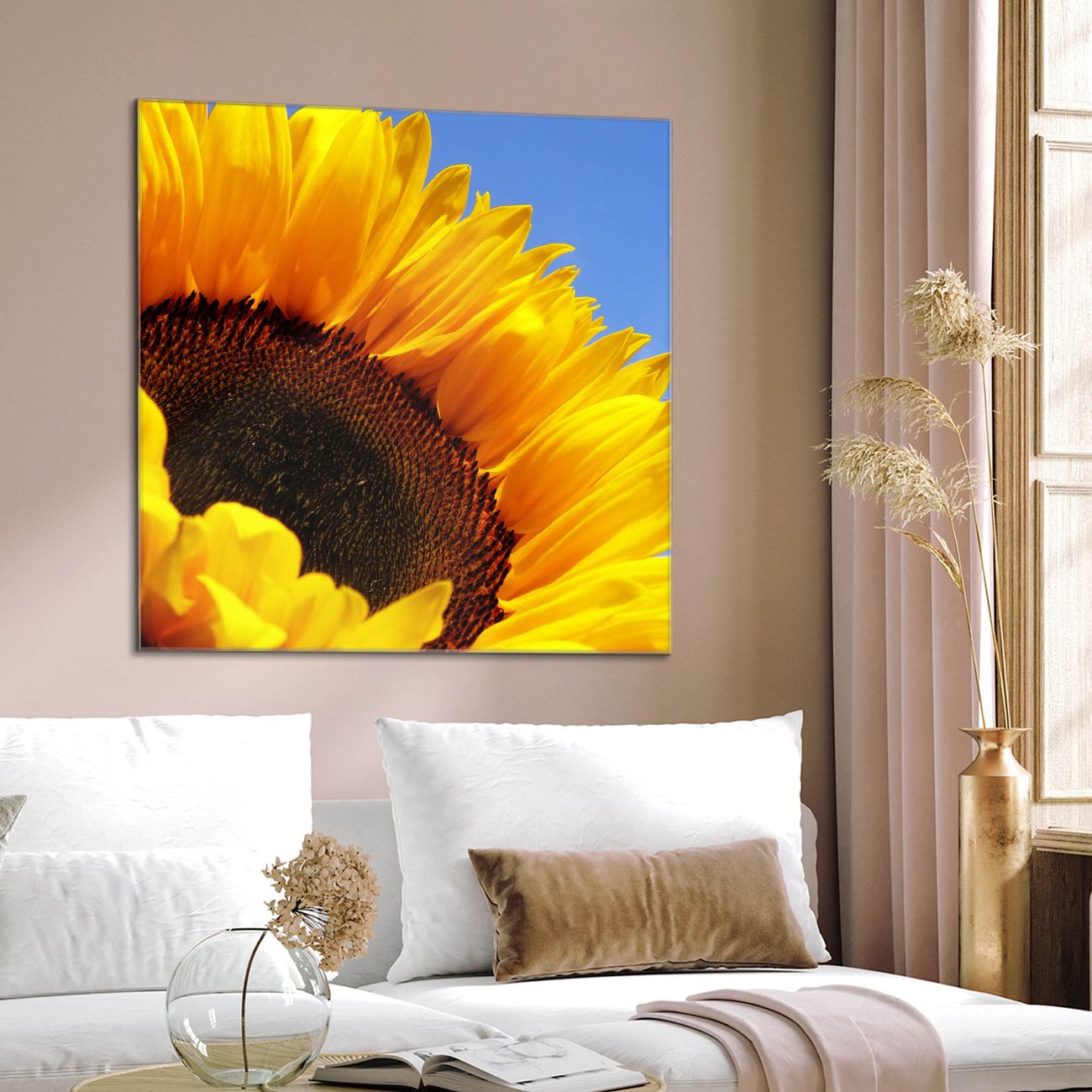 Unsere einzigartigen Glasbilder im Querformat von banjado mit Motiv Sonnenblume sind der absolute Hingucker! Unsere Banjado Glasbilder sind sehr begehrt, weil sie top verarbeitet sind und sich ganz leicht montieren lassen. Schon mit wenigen Handgriffen hängen sie an der Wand und strahlen mit höchster brillianz. Durch die Ramenlose Herstellung schwebt das Echtglasbild förmlich an der Wand. Das Motiv erscheint besonders ausdrucksstark und hochwertig und ist hinter dem Echtglas geschützt.