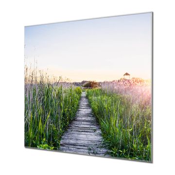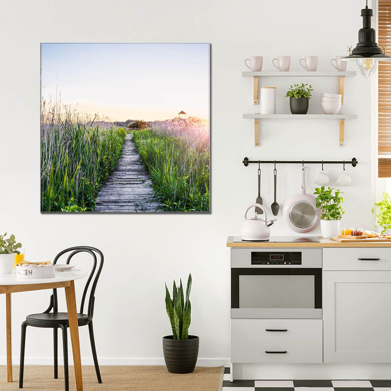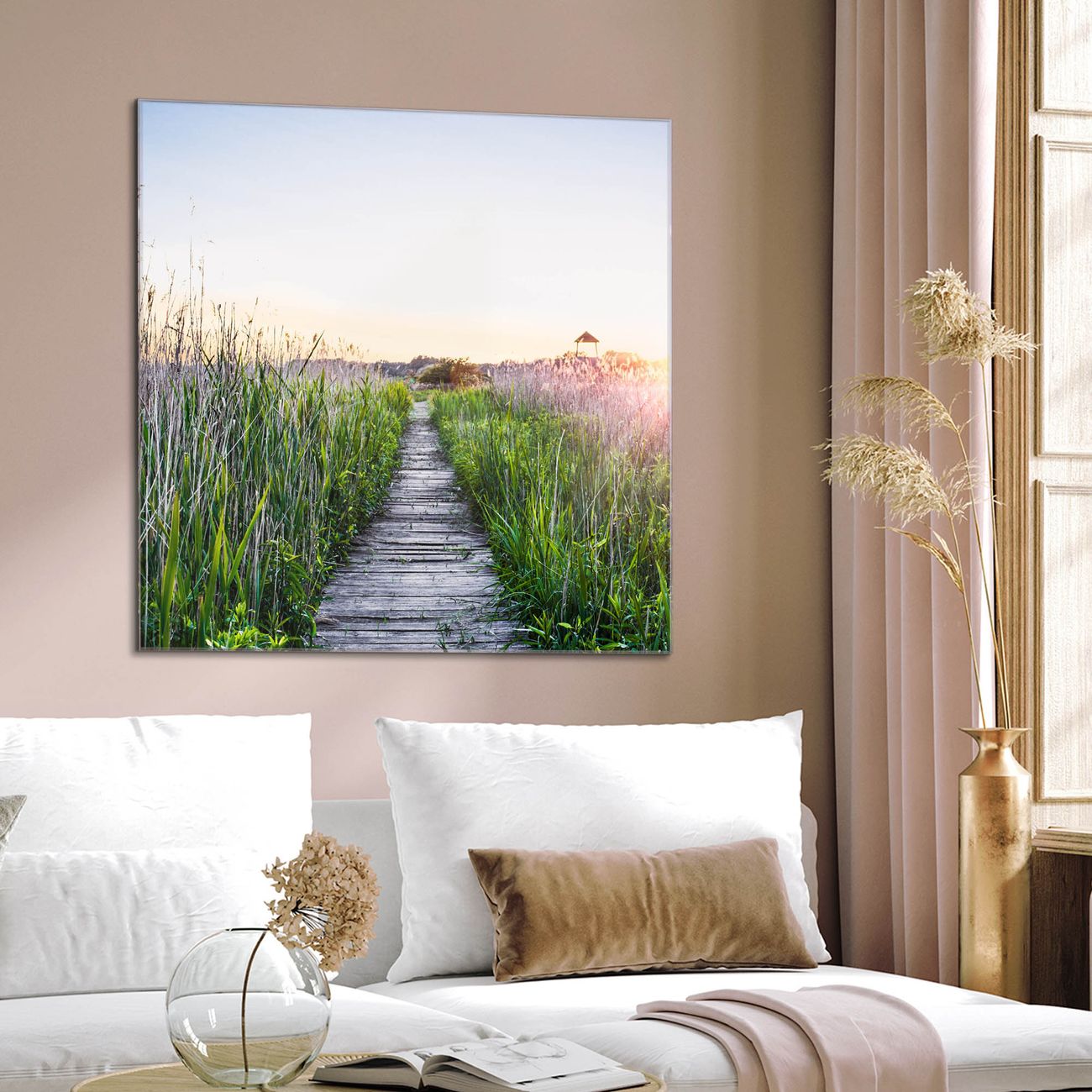 Quadratisches Wandbild aus Glas Steg Durchs Schilf