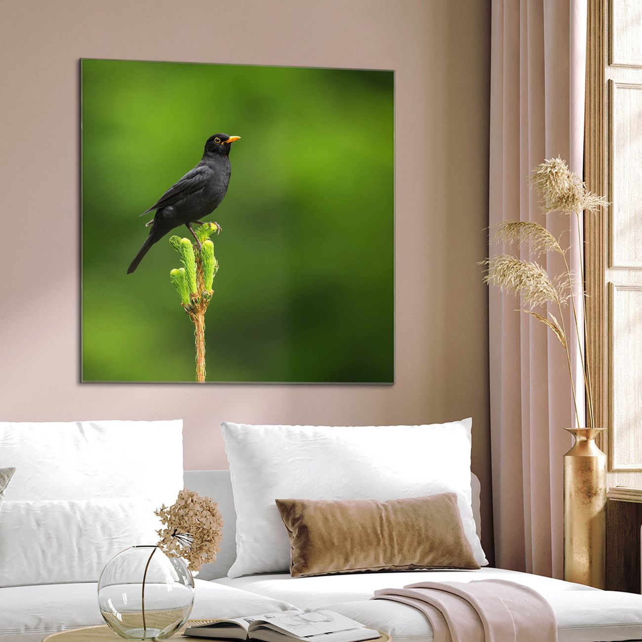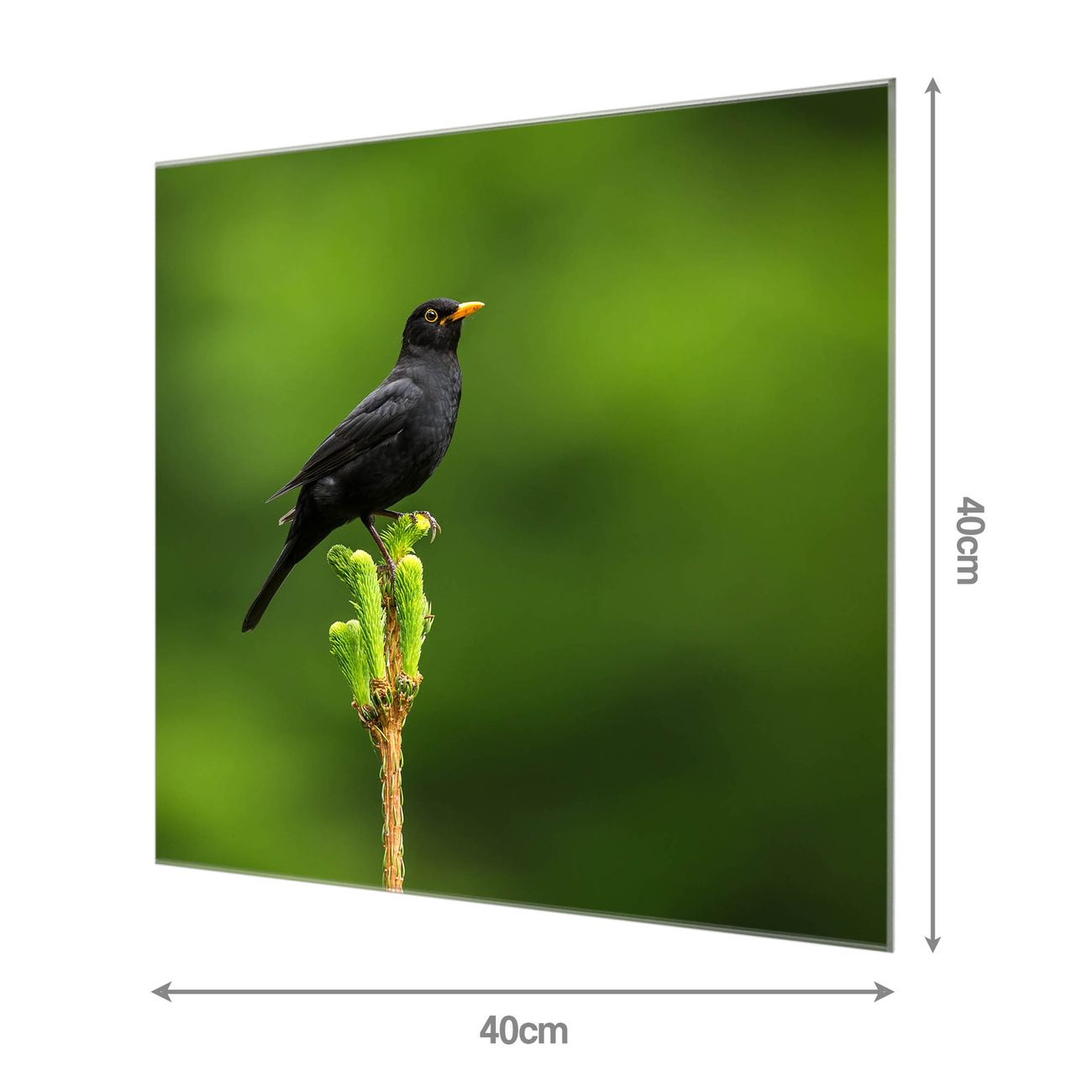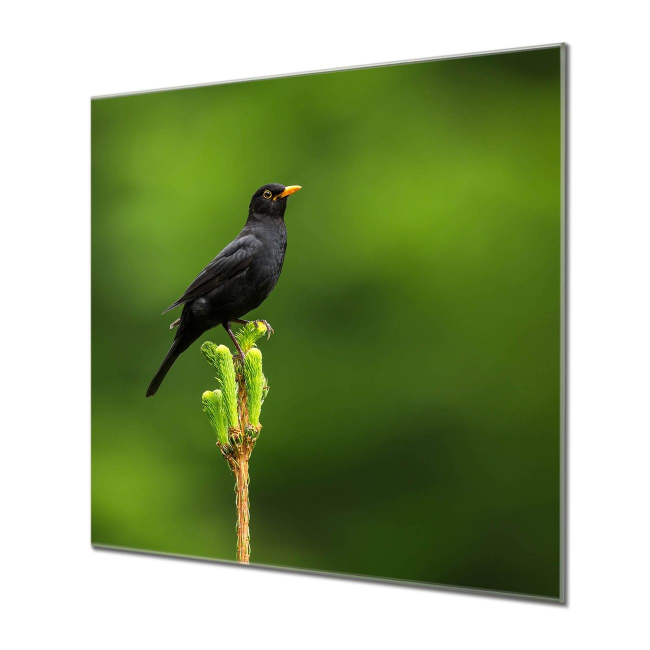 Quadratisches Wandbild aus Glas Vogel auf Tannenzweig