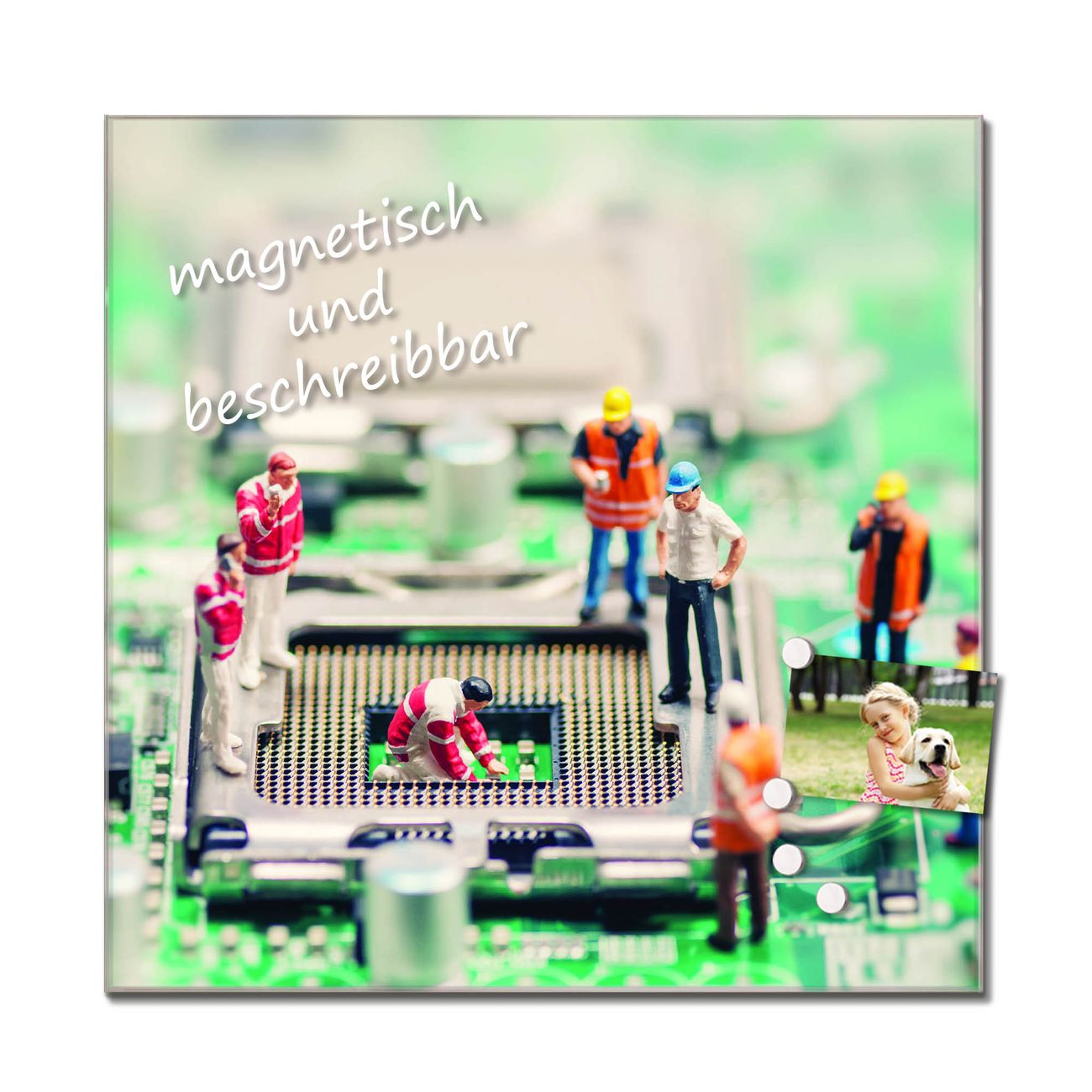Das Glasbild besteht aus 4mm gehärtetem zertifiziertem ESG Sicherheitsglas, die Rückwand aus einem magnetischen Stahlblech. Durch die superflache Bauweise haben Sie die Wahl aus einer Vielzahl von Befestigungsmöglichkeiten. Sie können das Wandbild mit einem Montagekleber superflach an die Wand kleben oder Sie wählen eines unserer passenden Befestigungssets, welches eine optimale Montage garantiert. Durch die mitgelieferten 4 Neodym-Magnete ist Ihr Glaswandbild sofort einsatzbereit. Wir sind ein kleines Team aus dem Herzen von Sachsen und fertigen alle Artikel von Hand für Sie an. Wir entwerfen unsere Produkte selbst mit großer Liebe zum Detail.