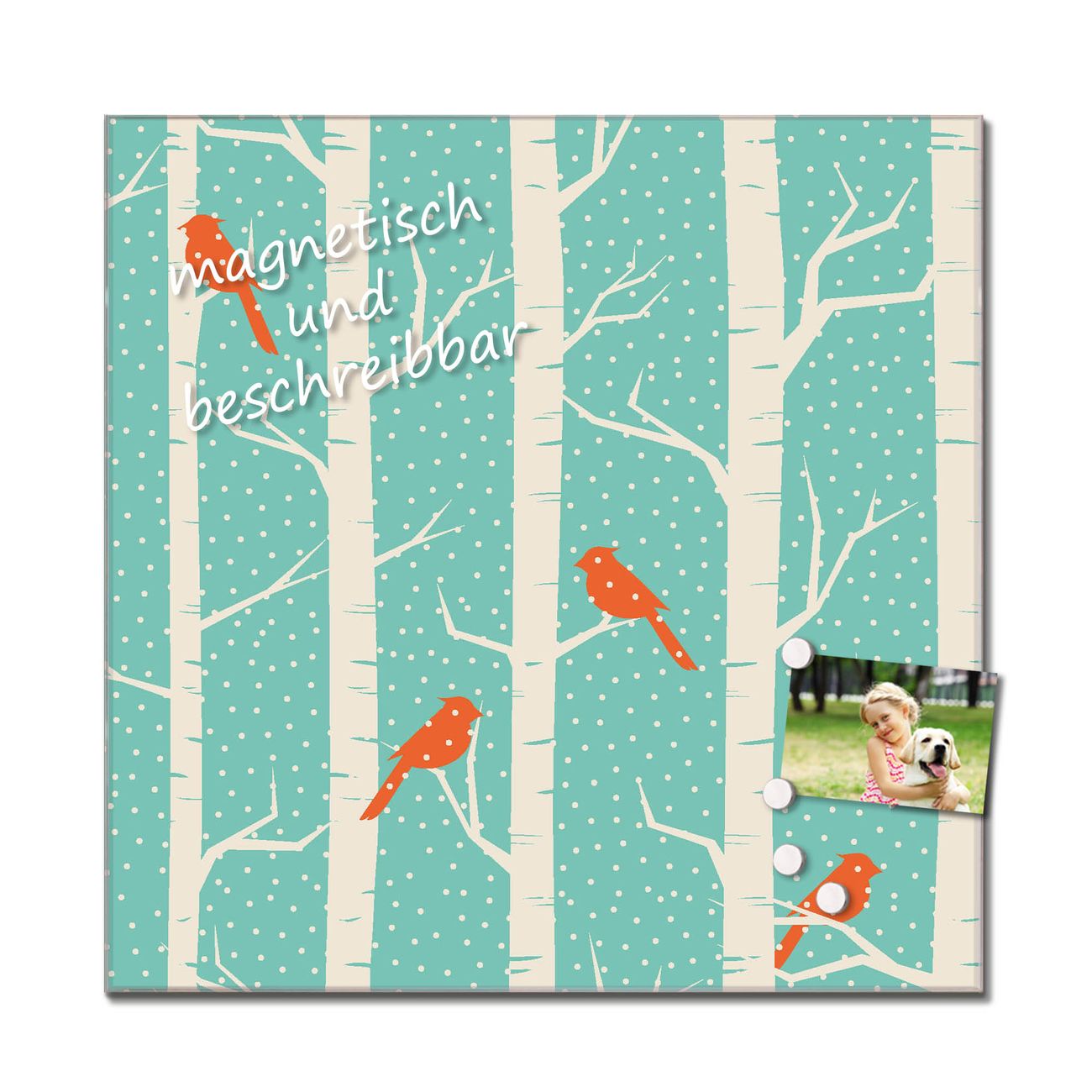 Das Glasbild besteht aus 4mm gehärtetem zertifiziertem ESG Sicherheitsglas, die Rückwand aus einem magnetischen Stahlblech. Durch die superflache Bauweise haben Sie die Wahl aus einer Vielzahl von Befestigungsmöglichkeiten. Sie können das Wandbild mit einem Montagekleber superflach an die Wand kleben oder Sie wählen eines unserer passenden Befestigungssets, welches eine optimale Montage garantiert. Durch die mitgelieferten 4 Neodym-Magnete ist Ihr Glaswandbild sofort einsatzbereit. Wir sind ein kleines Team aus dem Herzen von Sachsen und fertigen alle Artikel von Hand für Sie an. Wir entwerfen unsere Produkte selbst mit großer Liebe zum Detail.