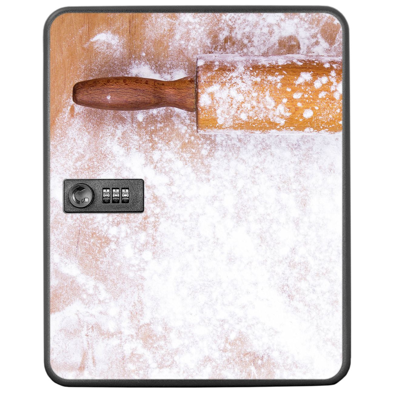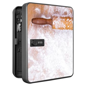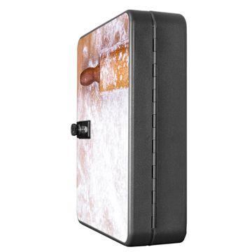 Der Schlüsselkasten ist gesamt 30x24x9,3cm groß und wiegt ca. 1500g. Die komplette Schlüsselaufbewahrung besteht aus schwarzem pulverbeschichtetem Stahl und wird von uns auf der Front mit einer Motivfolie kaschiert.