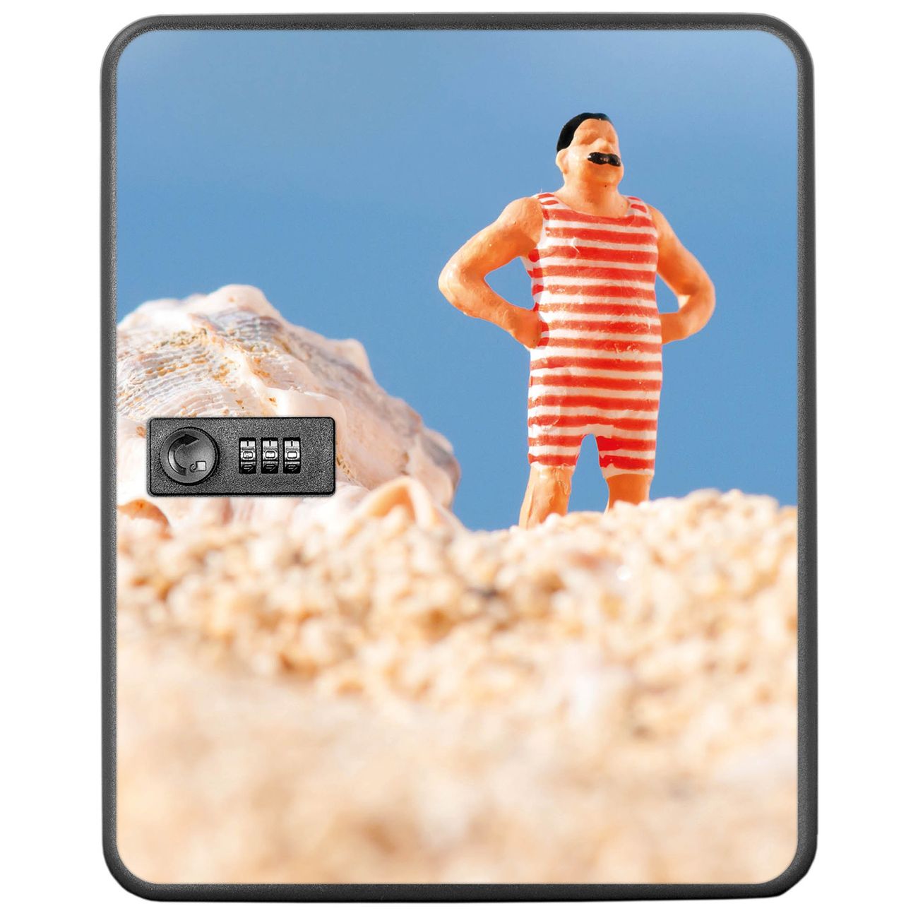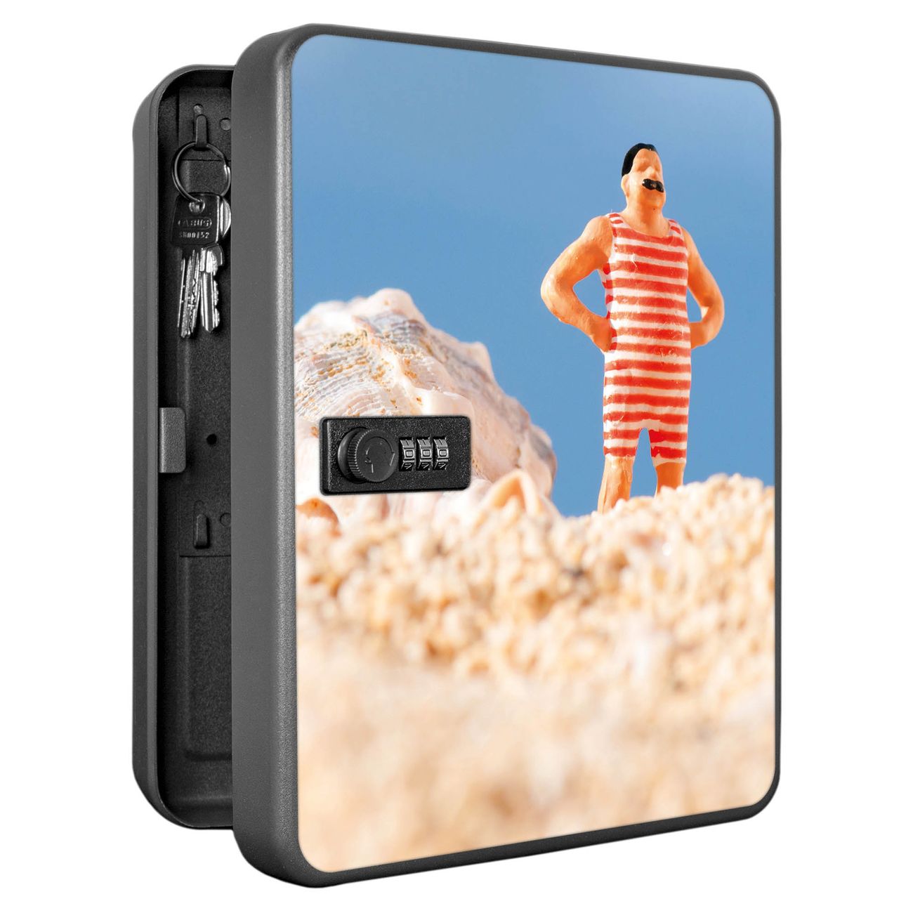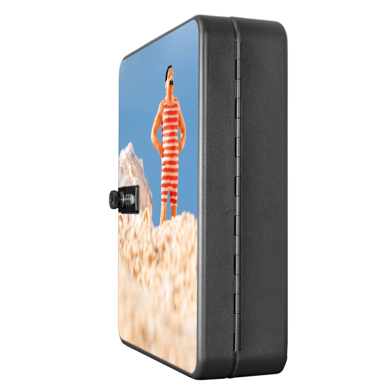 Der Schlüsselkasten ist gesamt 30x24x9,3cm groß und wiegt ca. 1500g. Die komplette Schlüsselaufbewahrung besteht aus schwarzem pulverbeschichtetem Stahl und wird von uns auf der Front mit einer Motivfolie kaschiert.