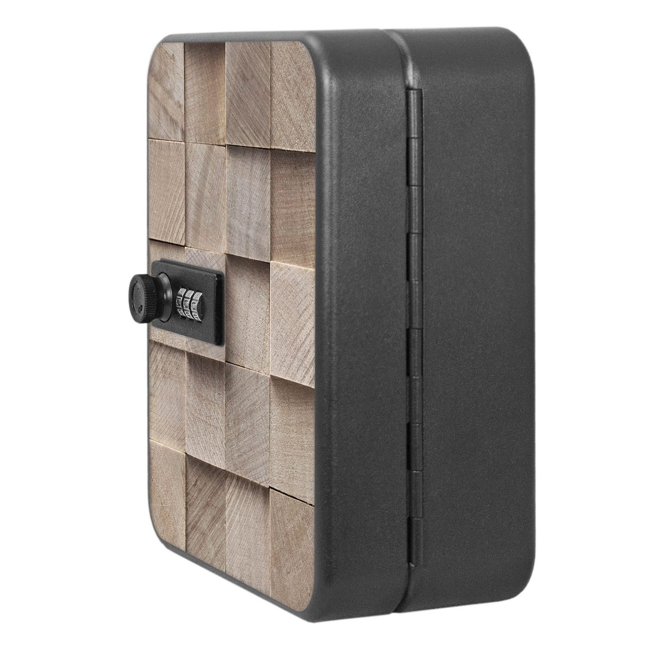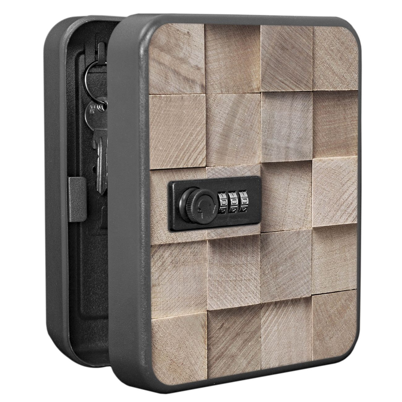 Der Schlüsselkasten ist gesamt 20x16x9,3cm groß und wiegt ca. 900g. Die komplette Schlüsselaufbewahrung besteht aus schwarzem pulverbeschichtetem Stahl und wird von uns auf der Front mit einer Motivfolie kaschiert.