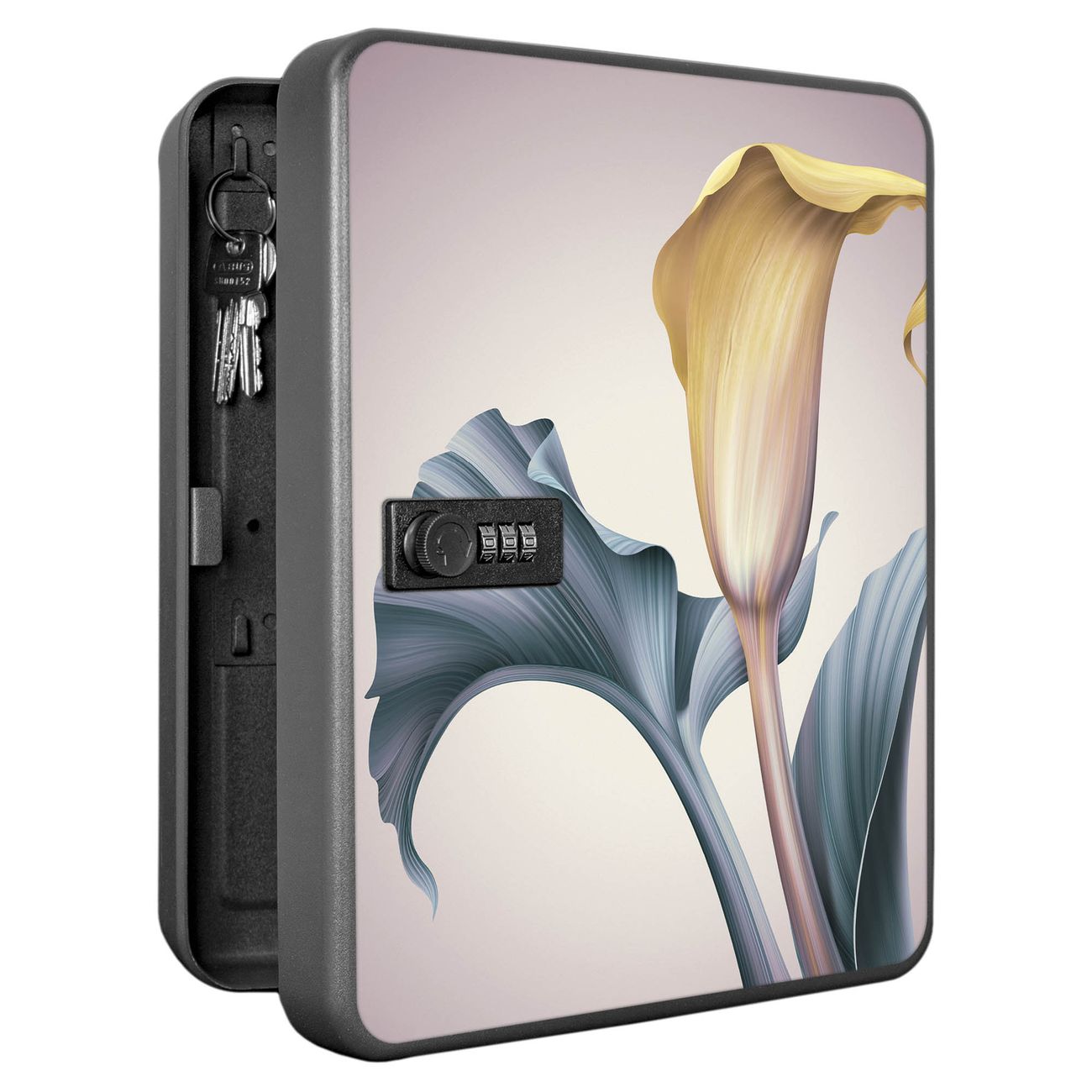 Der Schlüsselkasten ist gesamt 30x24x9,3cm groß und wiegt ca. 1500g. Die komplette Schlüsselaufbewahrung besteht aus schwarzem pulverbeschichtetem Stahl und wird von uns auf der Front mit einer Motivfolie kaschiert.