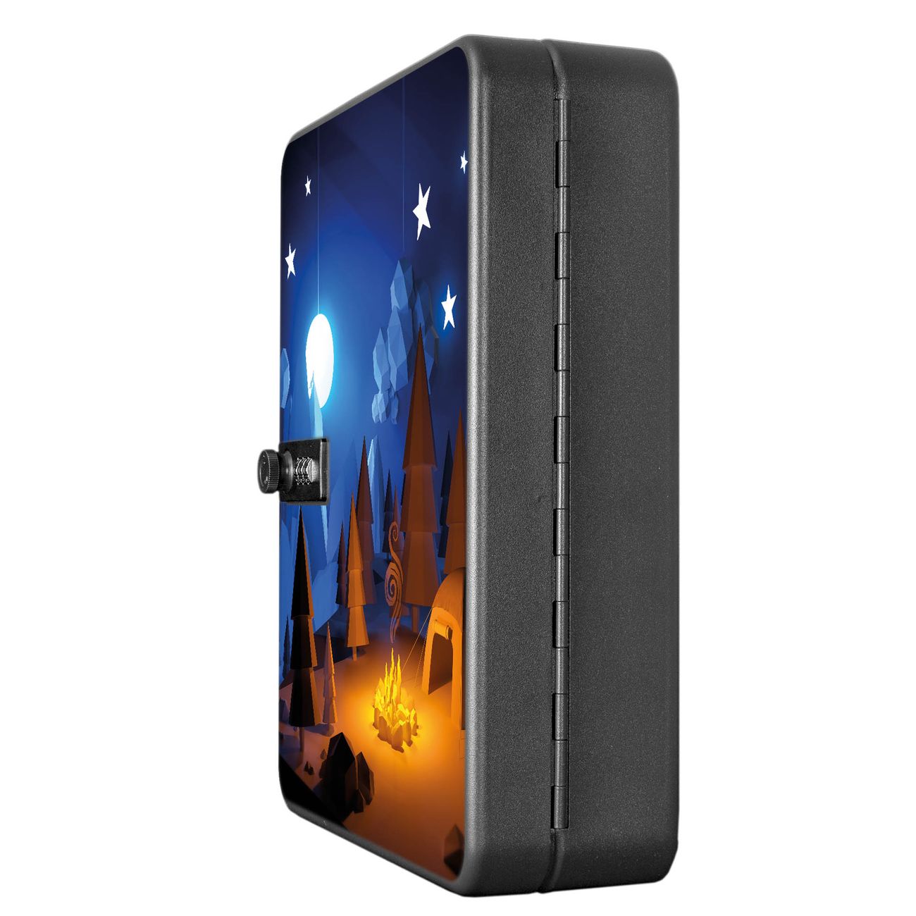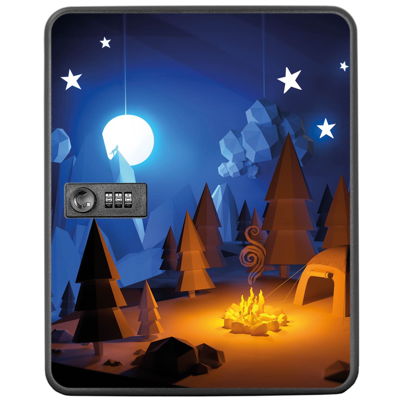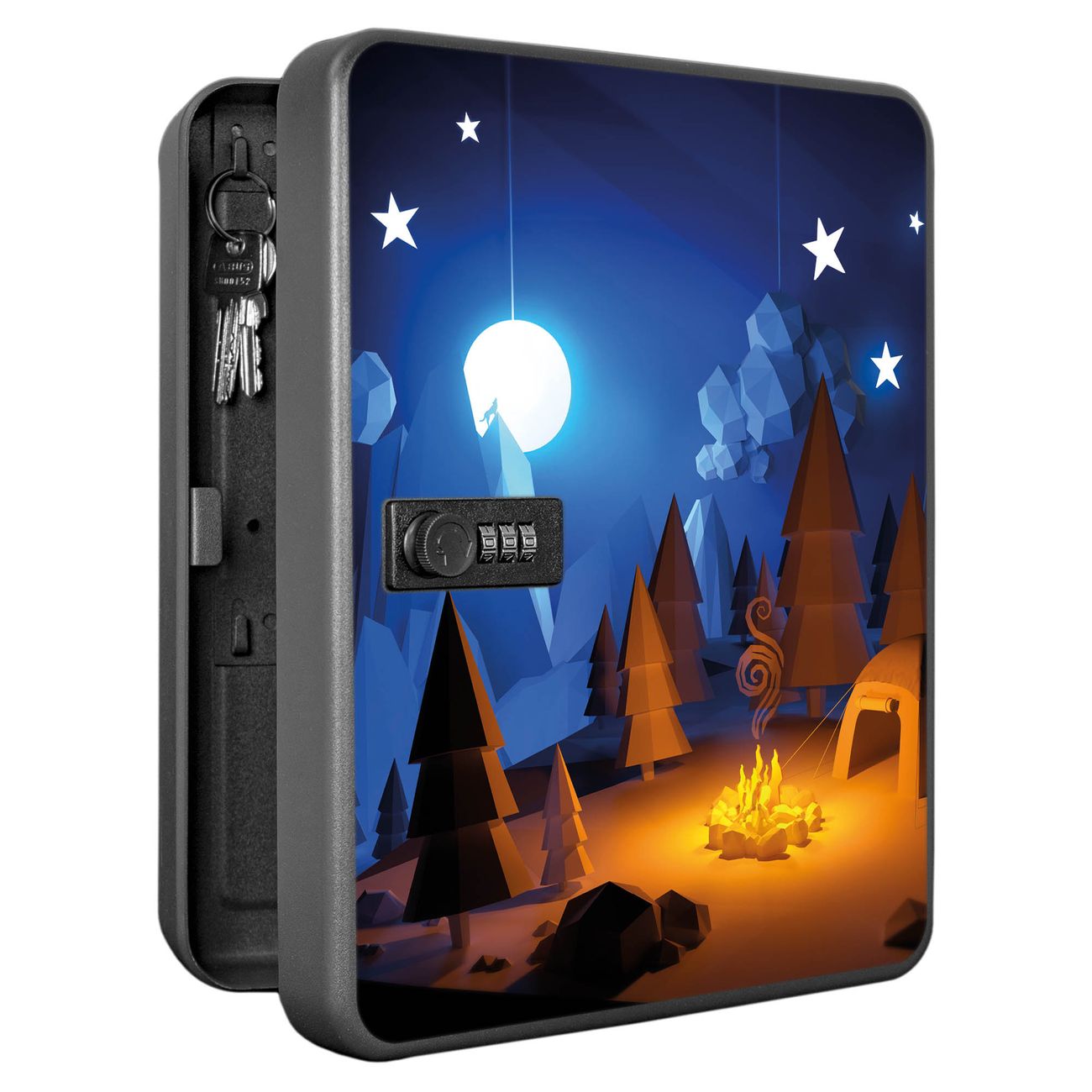 Der Schlüsselkasten ist gesamt 30x24x9,3cm groß und wiegt ca. 1500g. Die komplette Schlüsselaufbewahrung besteht aus schwarzem pulverbeschichtetem Stahl und wird von uns auf der Front mit einer Motivfolie kaschiert.