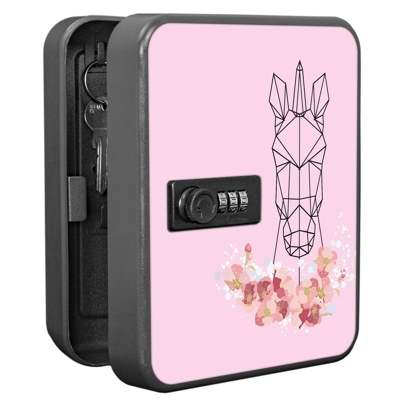 Der Schlüsselkasten ist gesamt 20x16x9,3cm groß und wiegt ca. 900g. Die komplette Schlüsselaufbewahrung besteht aus schwarzem pulverbeschichtetem Stahl und wird von uns auf der Front mit einer Motivfolie kaschiert.