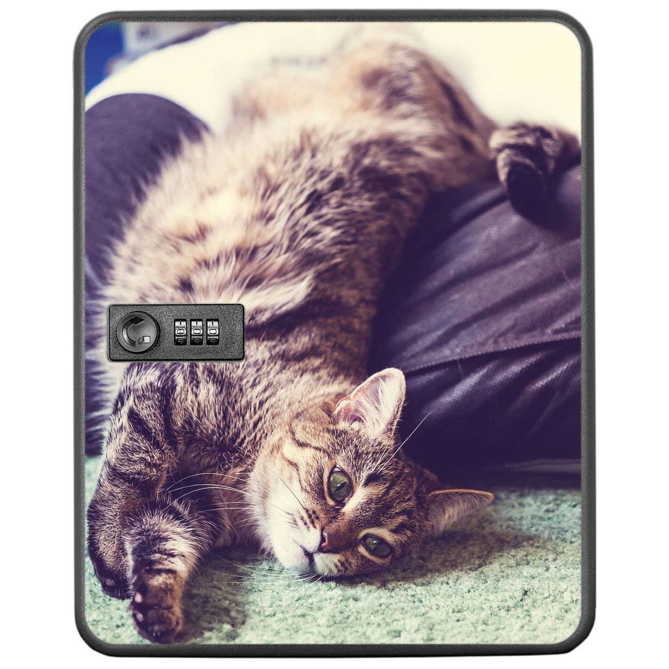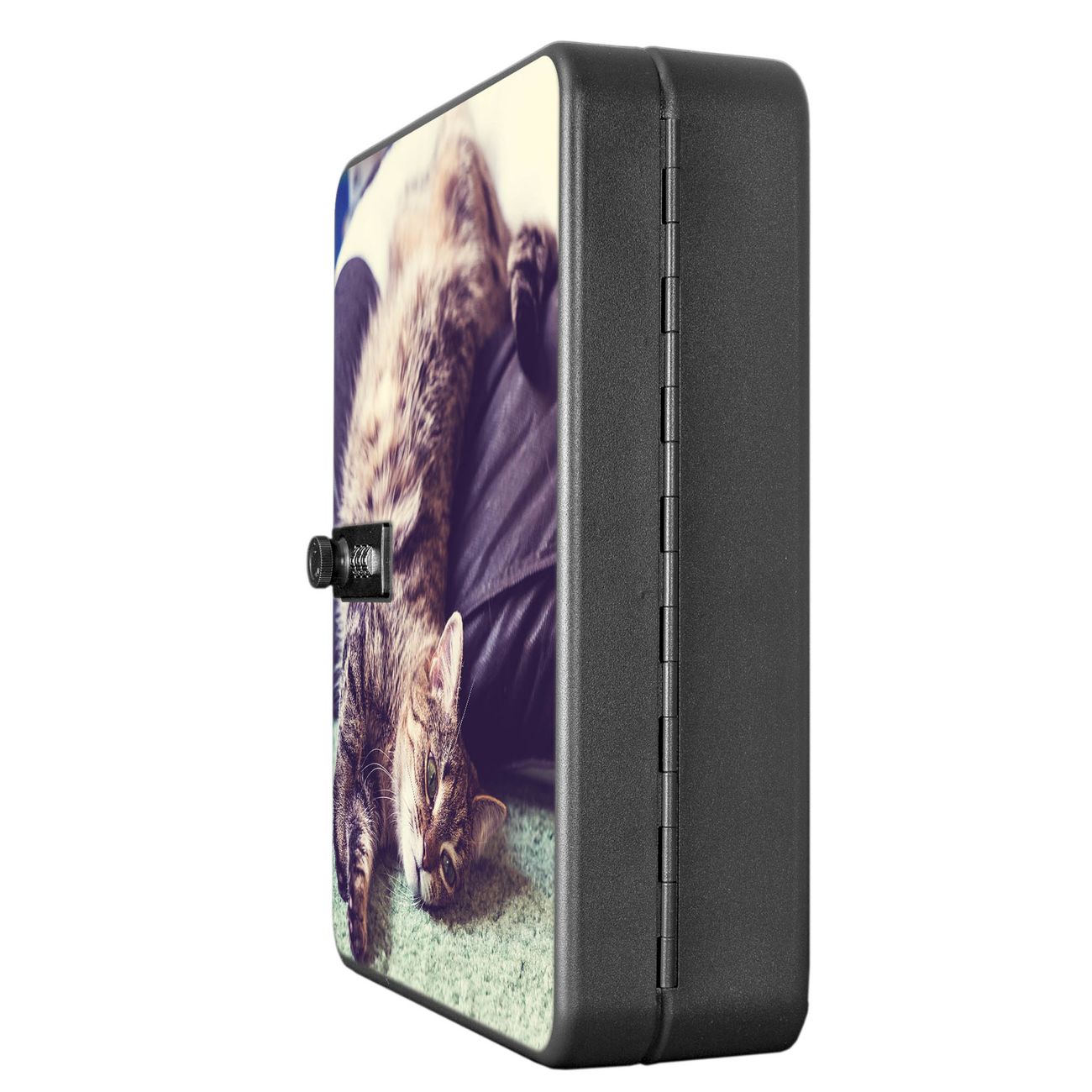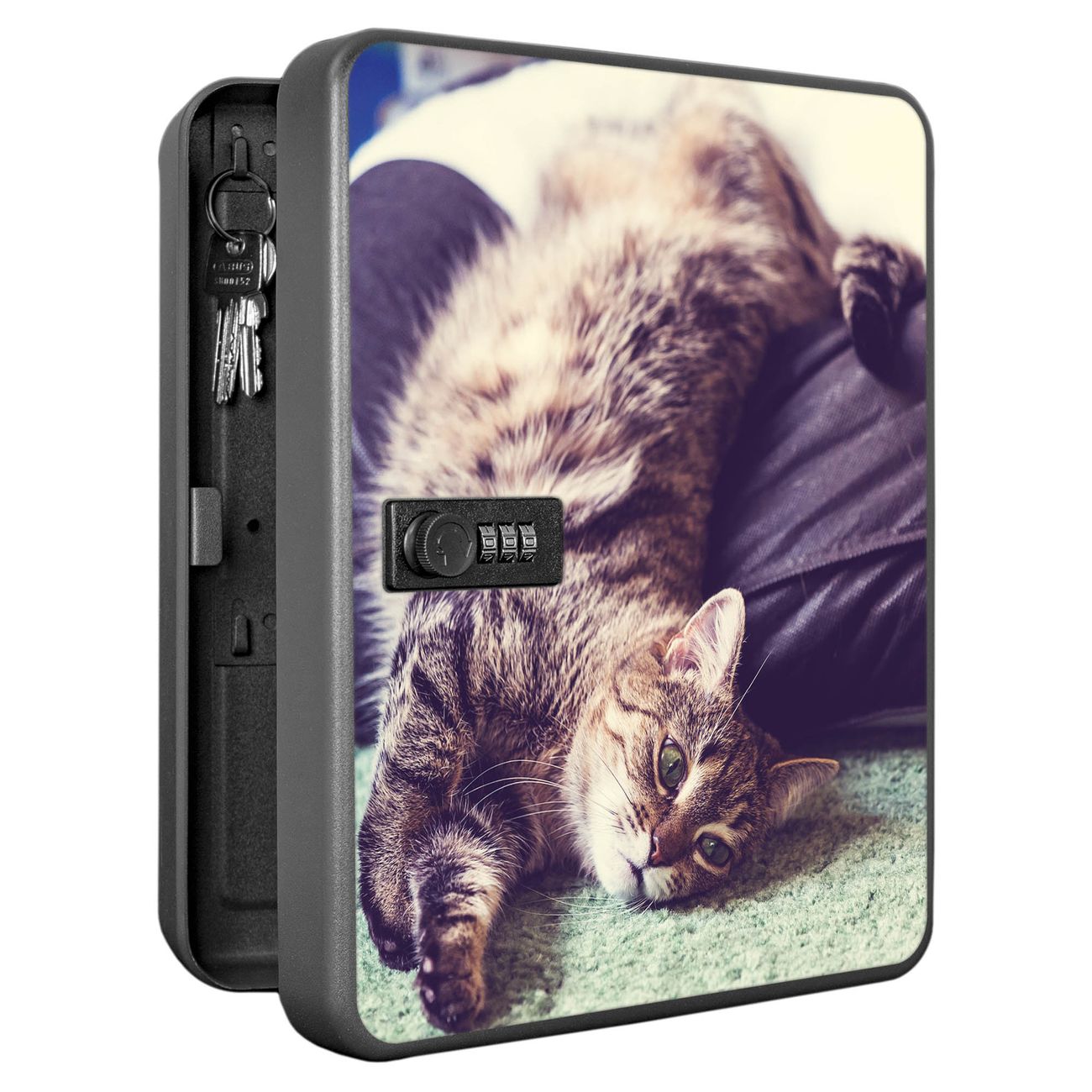 Der Schlüsselkasten ist gesamt 30x24x9,3cm groß und wiegt ca. 1500g. Die komplette Schlüsselaufbewahrung besteht aus schwarzem pulverbeschichtetem Stahl und wird von uns auf der Front mit einer Motivfolie kaschiert.