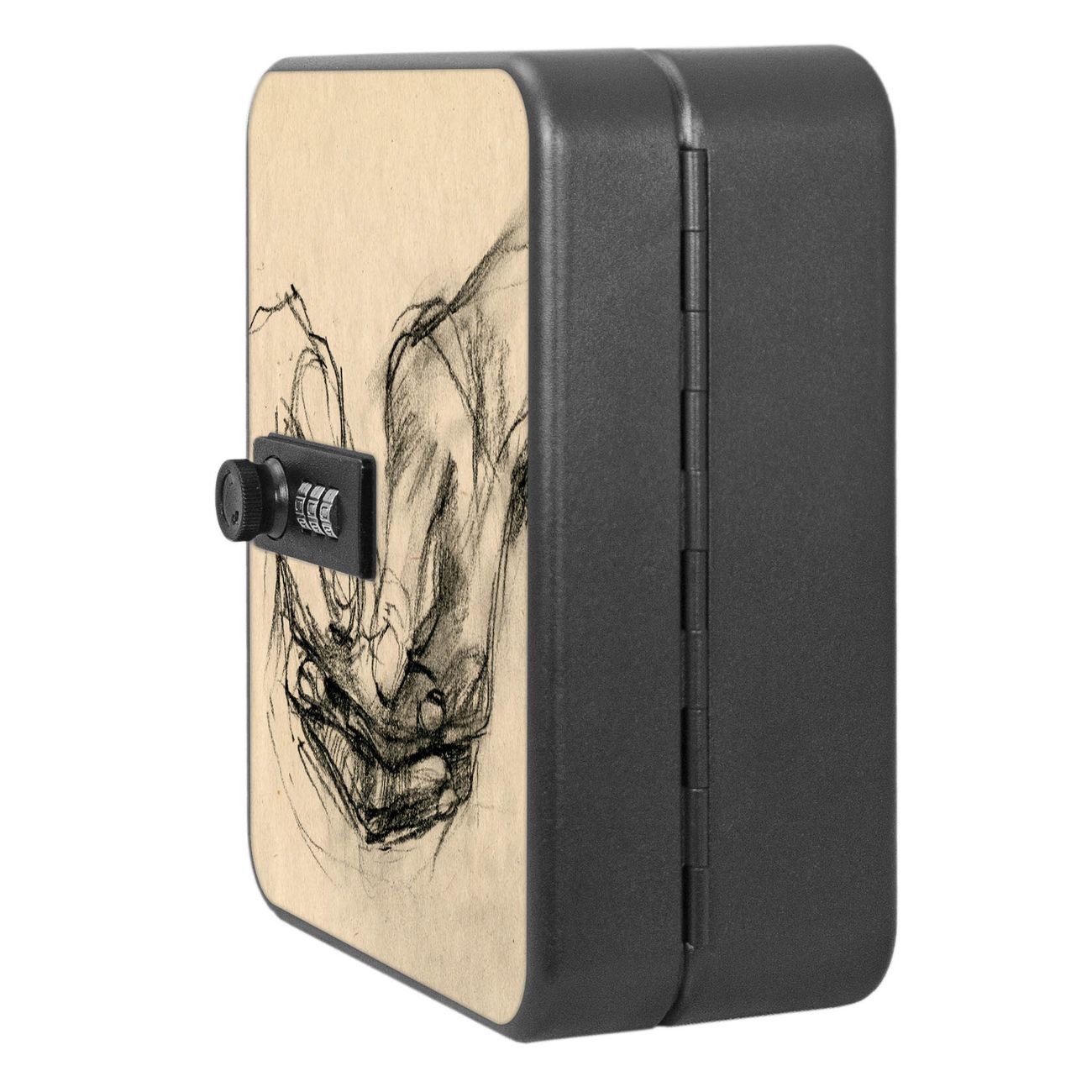 Der Schlüsselkasten ist gesamt 20x16x9,3cm groß und wiegt ca. 900g. Die komplette Schlüsselaufbewahrung besteht aus schwarzem pulverbeschichtetem Stahl und wird von uns auf der Front mit einer Motivfolie kaschiert.