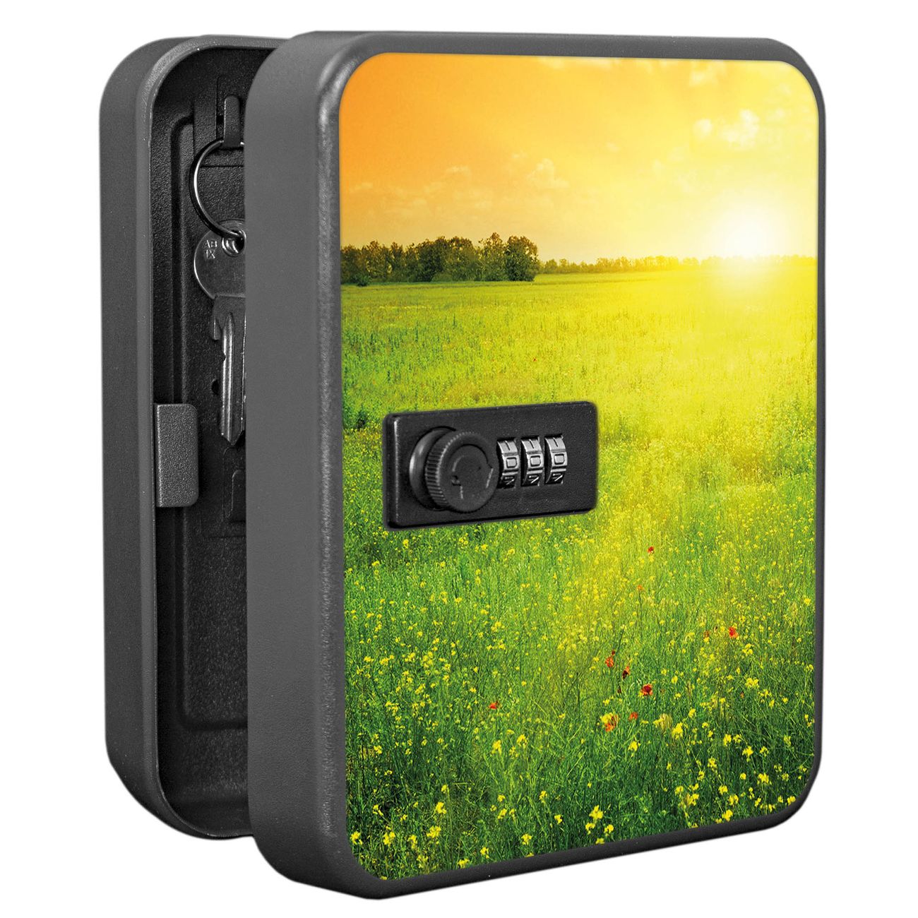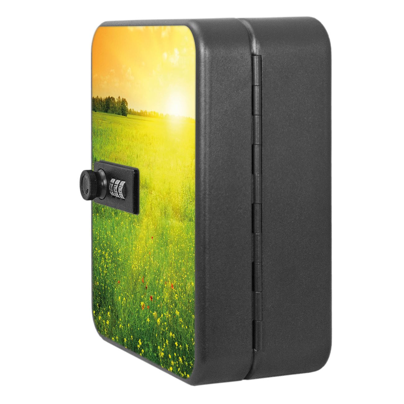 Der Schlüsselkasten ist gesamt 20x16x9,3cm groß und wiegt ca. 900g. Die komplette Schlüsselaufbewahrung besteht aus schwarzem pulverbeschichtetem Stahl und wird von uns auf der Front mit einer Motivfolie kaschiert.