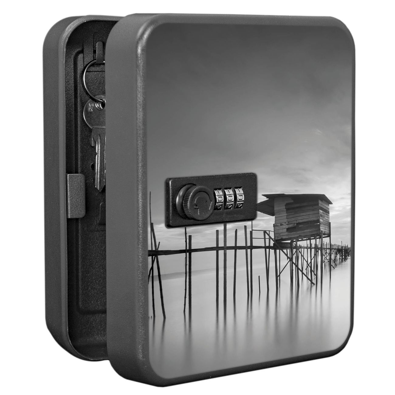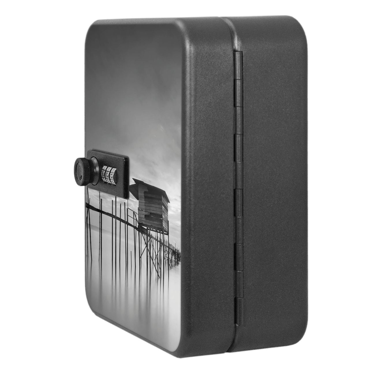 Der Schlüsselkasten ist gesamt 20x16x9,3cm groß und wiegt ca. 900g. Die komplette Schlüsselaufbewahrung besteht aus schwarzem pulverbeschichtetem Stahl und wird von uns auf der Front mit einer Motivfolie kaschiert.