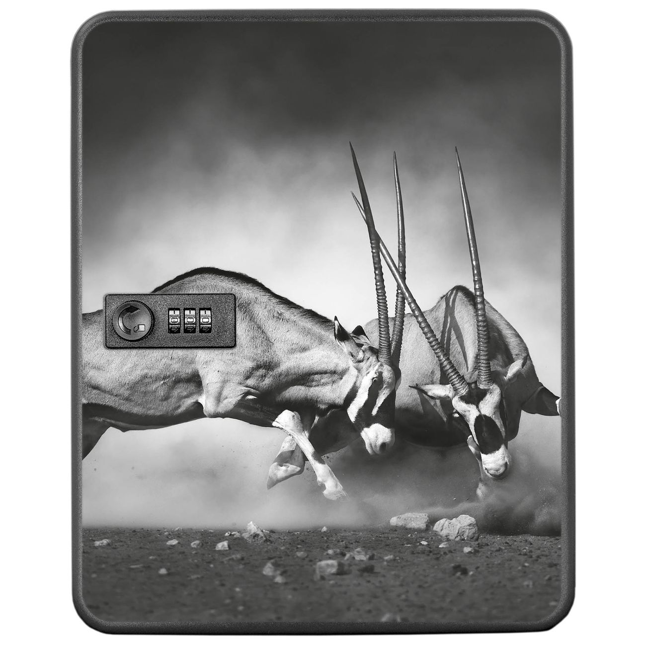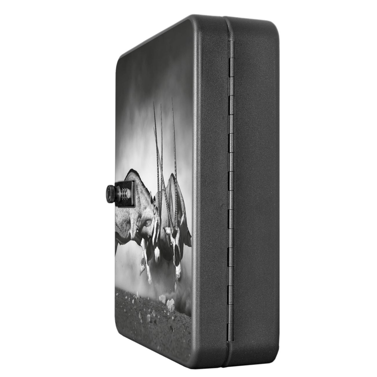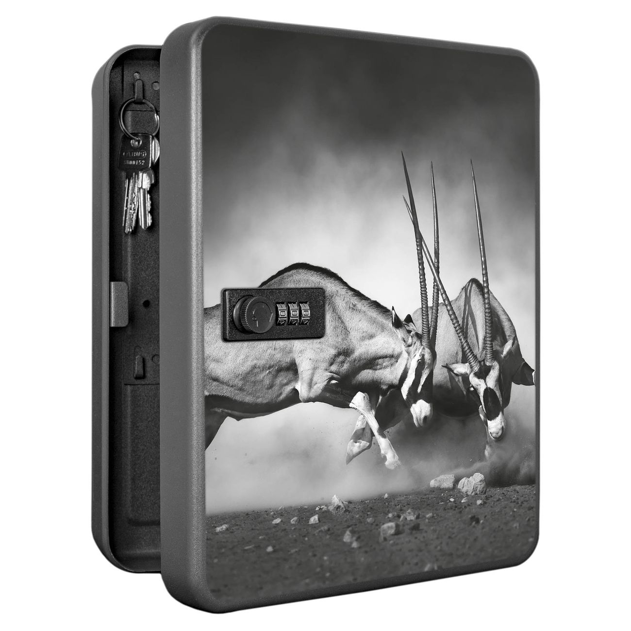 Der Schlüsselkasten ist gesamt 30x24x9,3cm groß und wiegt ca. 1500g. Die komplette Schlüsselaufbewahrung besteht aus schwarzem pulverbeschichtetem Stahl und wird von uns auf der Front mit einer Motivfolie kaschiert.