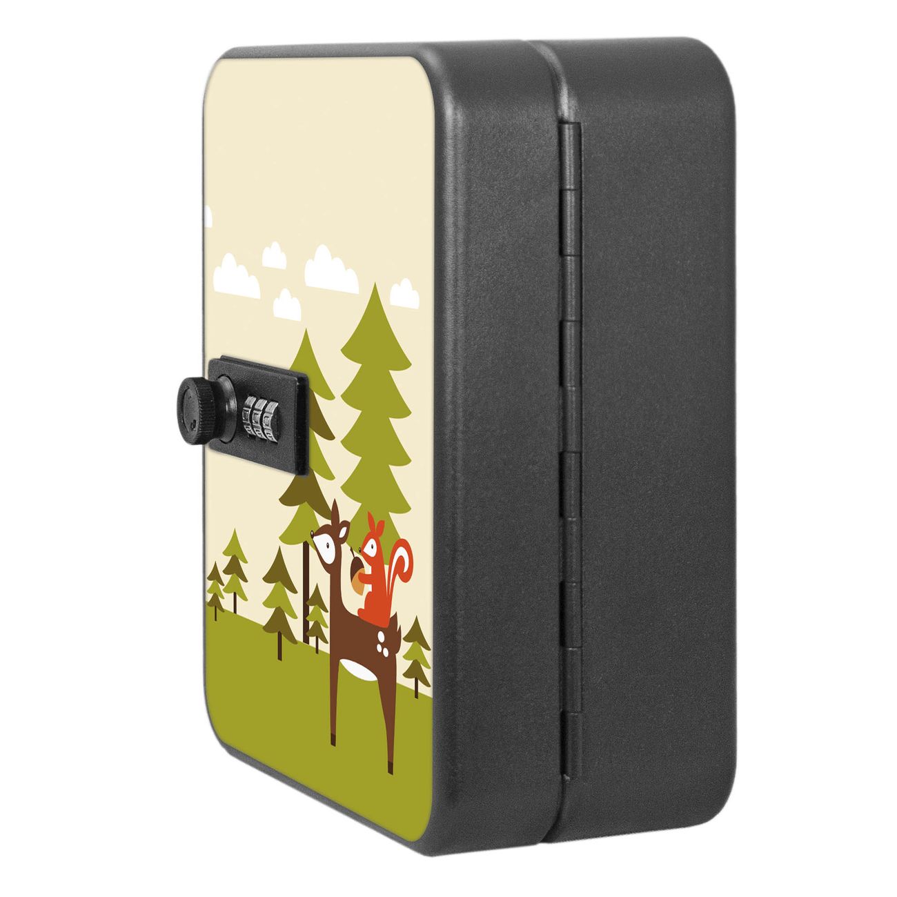 Der Schlüsselkasten ist gesamt 20x16x9,3cm groß und wiegt ca. 900g. Die komplette Schlüsselaufbewahrung besteht aus schwarzem pulverbeschichtetem Stahl und wird von uns auf der Front mit einer Motivfolie kaschiert.