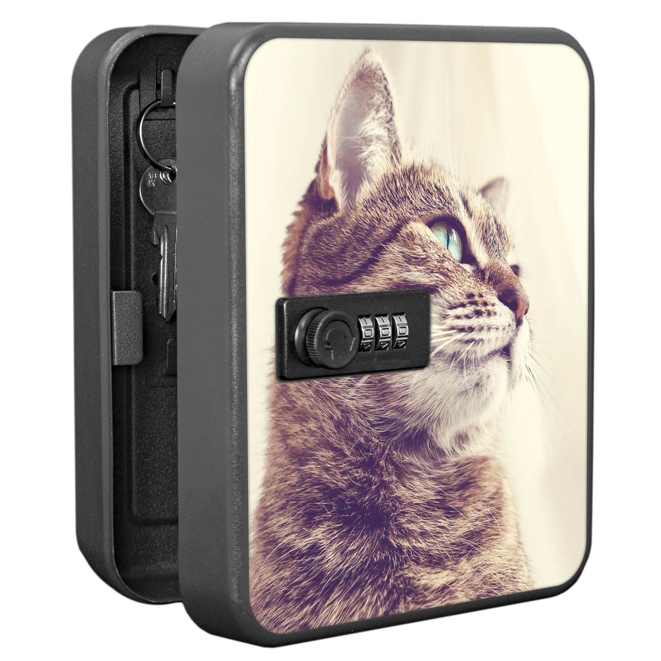 Der Schlüsselkasten ist gesamt 20x16x9,3cm groß und wiegt ca. 900g. Die komplette Schlüsselaufbewahrung besteht aus schwarzem pulverbeschichtetem Stahl und wird von uns auf der Front mit einer Motivfolie kaschiert.