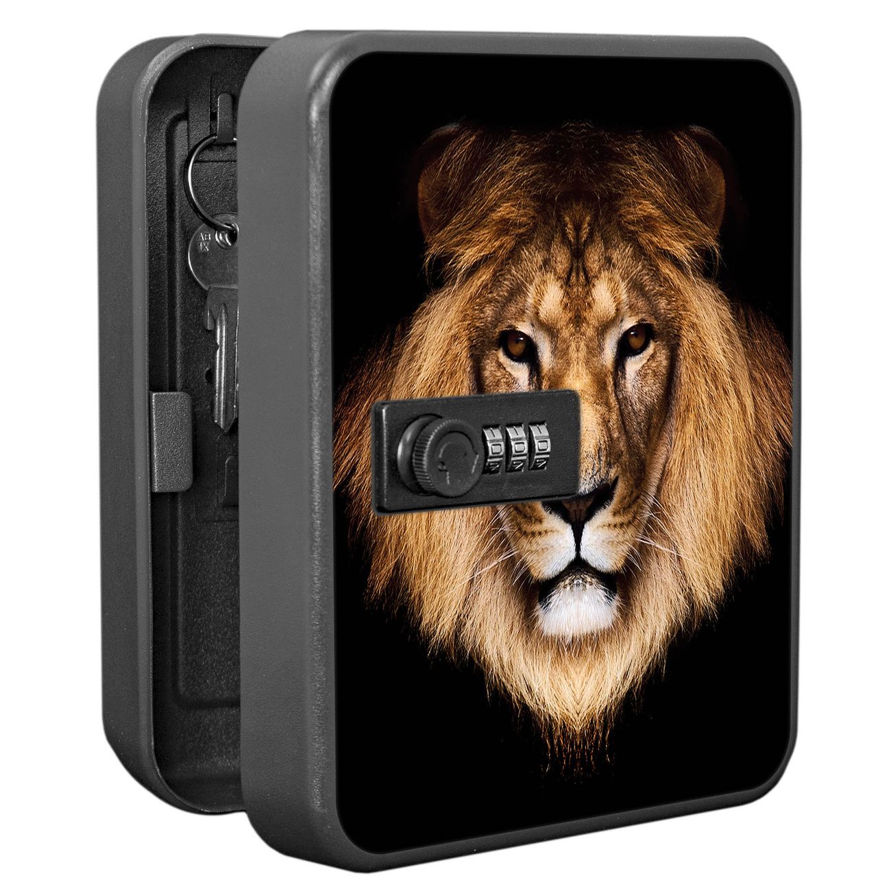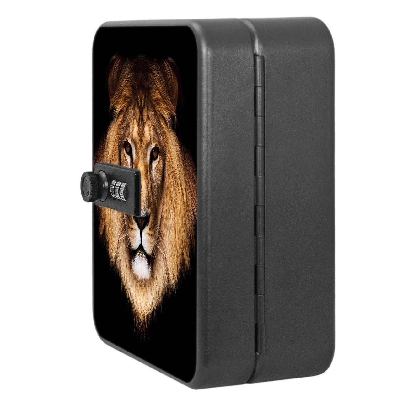 Der Schlüsselkasten ist gesamt 20x16x9,3cm groß und wiegt ca. 900g. Die komplette Schlüsselaufbewahrung besteht aus schwarzem pulverbeschichtetem Stahl und wird von uns auf der Front mit einer Motivfolie kaschiert.