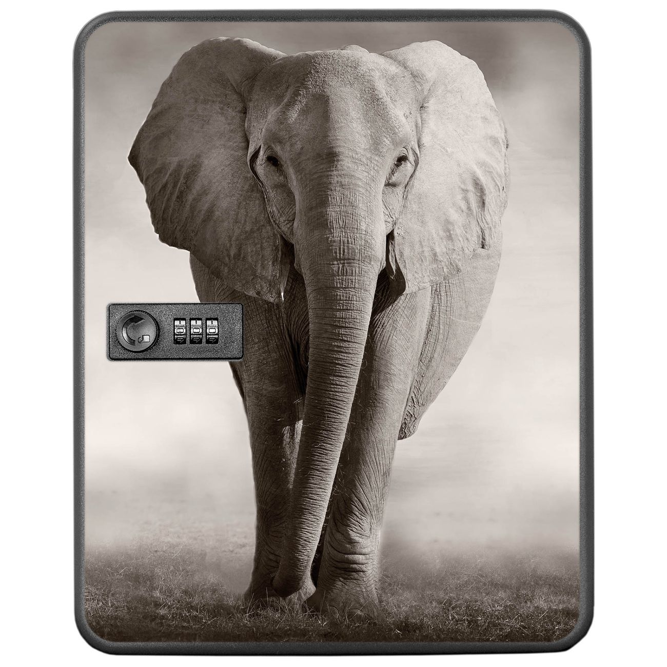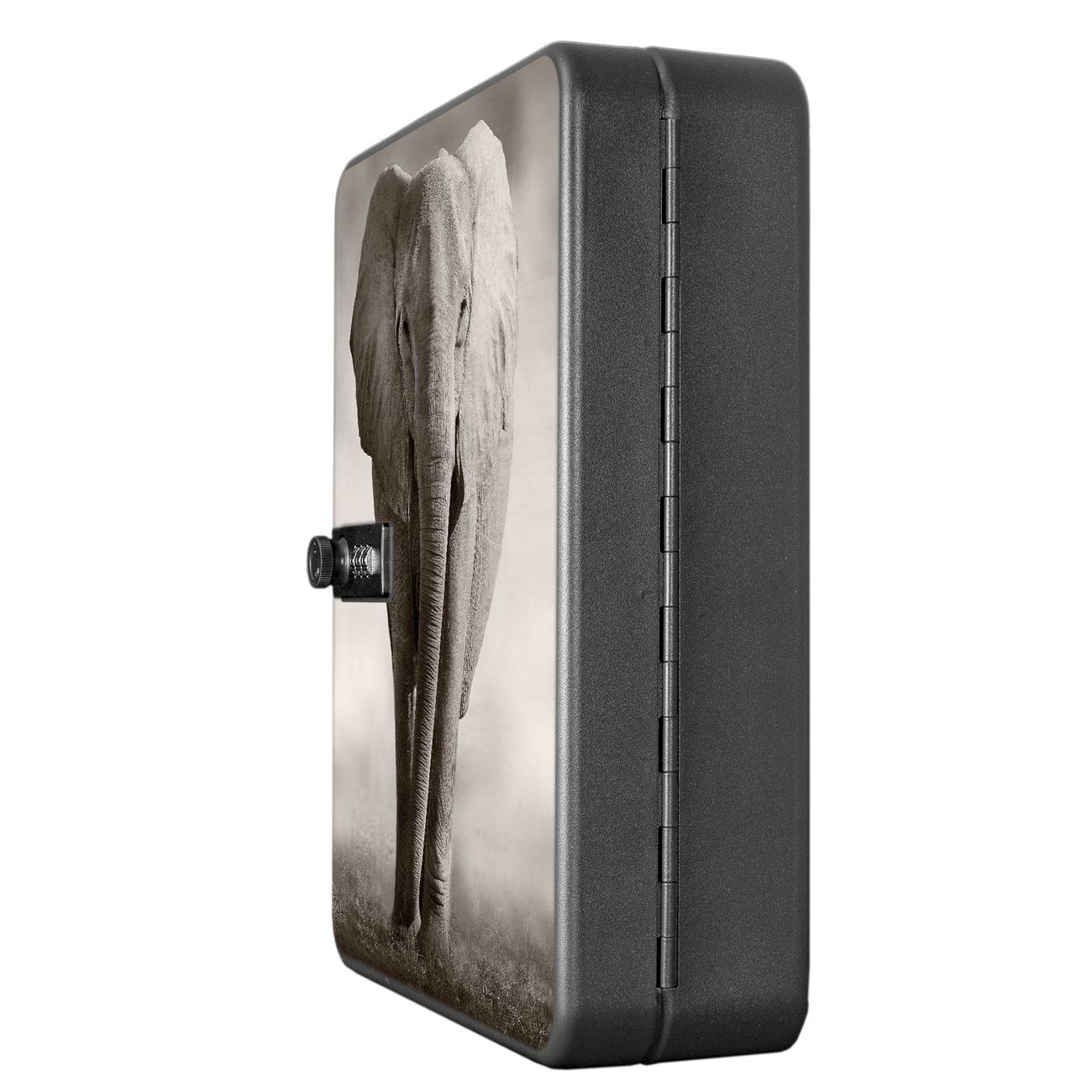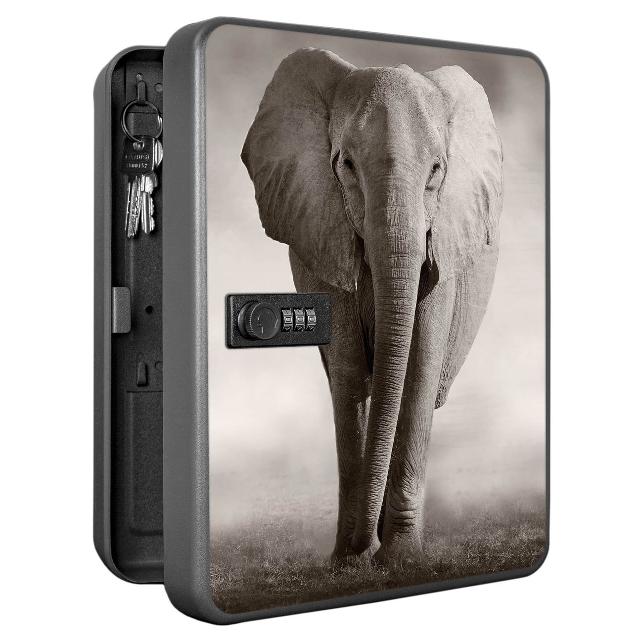 Der Schlüsselkasten ist gesamt 30x24x9,3cm groß und wiegt ca. 1500g. Die komplette Schlüsselaufbewahrung besteht aus schwarzem pulverbeschichtetem Stahl und wird von uns auf der Front mit einer Motivfolie kaschiert.