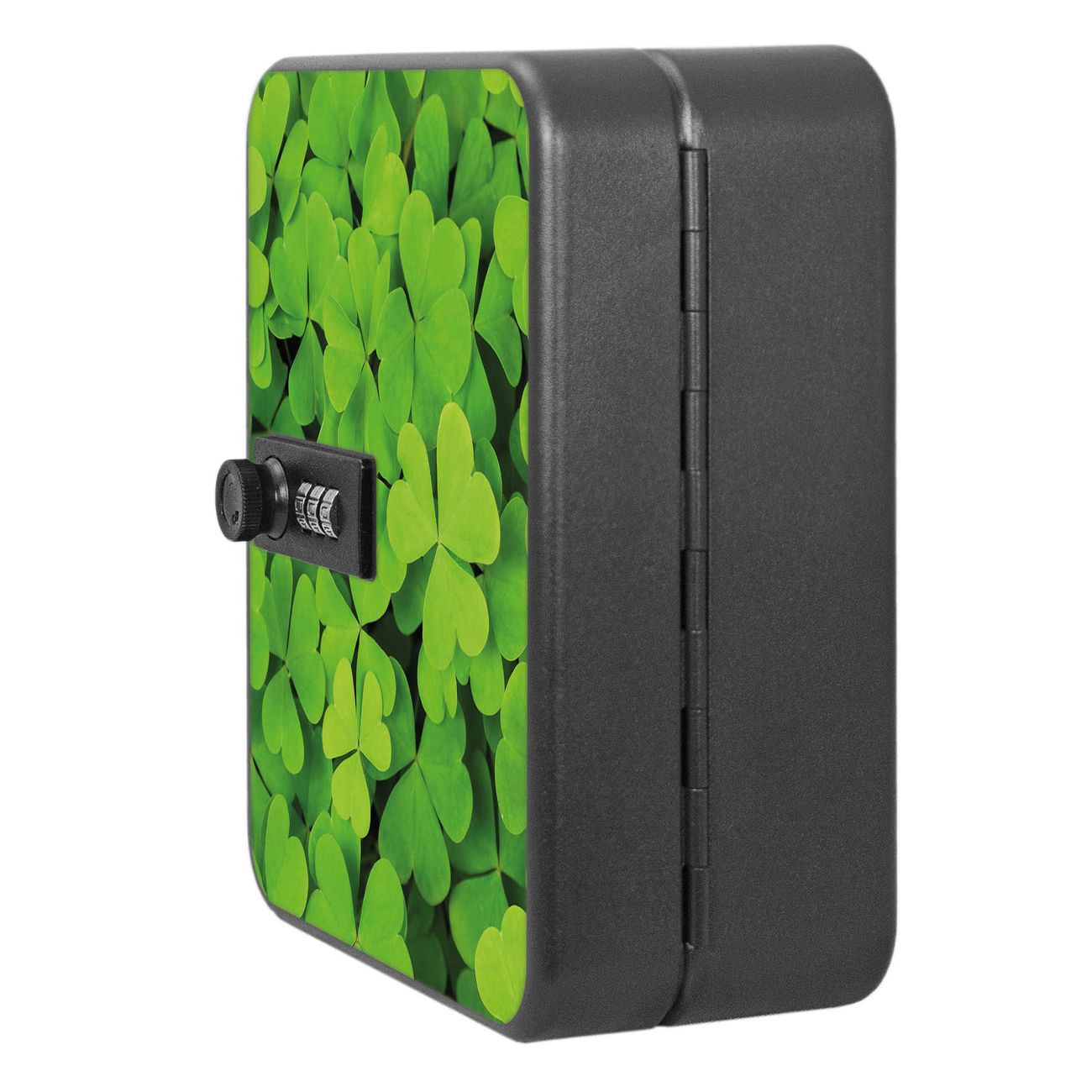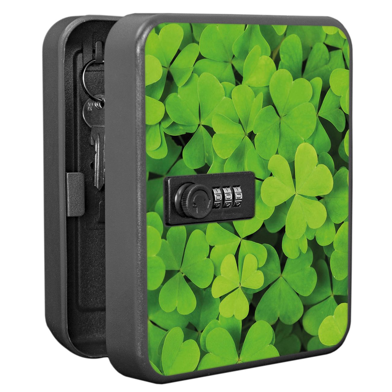 Der Schlüsselkasten ist gesamt 20x16x9,3cm groß und wiegt ca. 900g. Die komplette Schlüsselaufbewahrung besteht aus schwarzem pulverbeschichtetem Stahl und wird von uns auf der Front mit einer Motivfolie kaschiert.