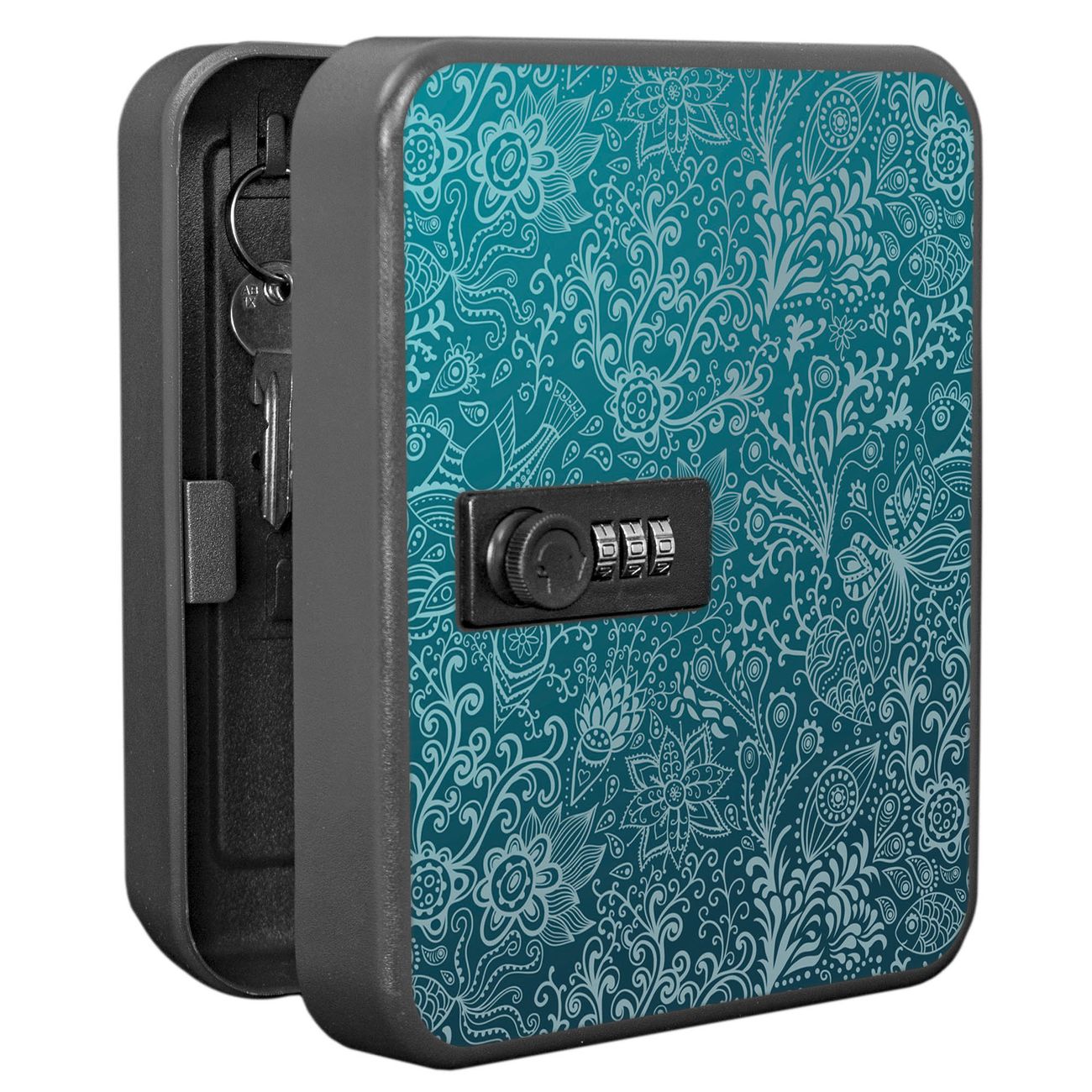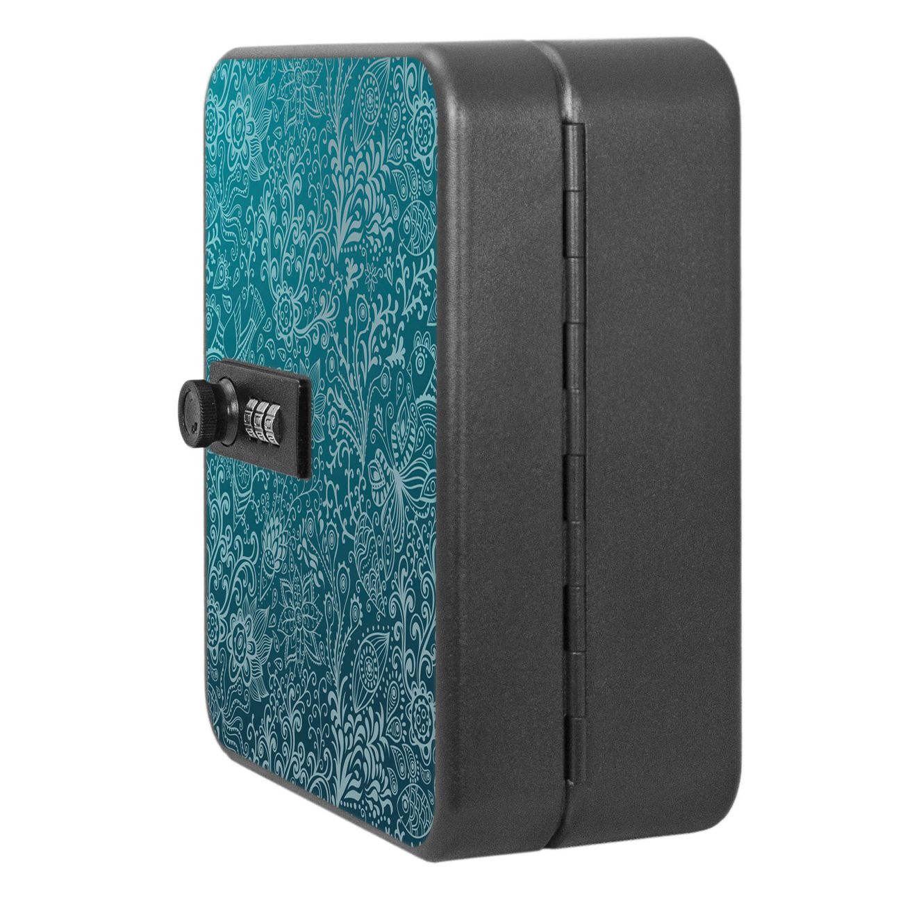 Der Schlüsselkasten ist gesamt 20x16x9,3cm groß und wiegt ca. 900g. Die komplette Schlüsselaufbewahrung besteht aus schwarzem pulverbeschichtetem Stahl und wird von uns auf der Front mit einer Motivfolie kaschiert.