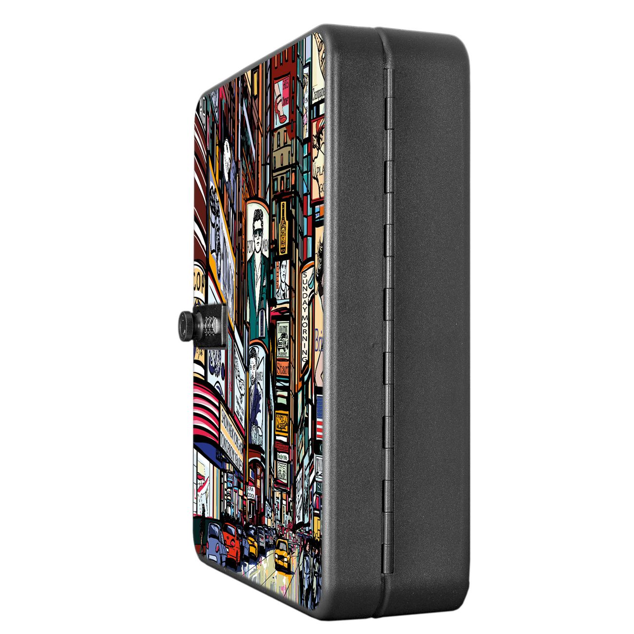 Der Schlüsselkasten ist gesamt 30x24x9,3cm groß und wiegt ca. 1500g. Die komplette Schlüsselaufbewahrung besteht aus schwarzem pulverbeschichtetem Stahl und wird von uns auf der Front mit einer Motivfolie kaschiert.