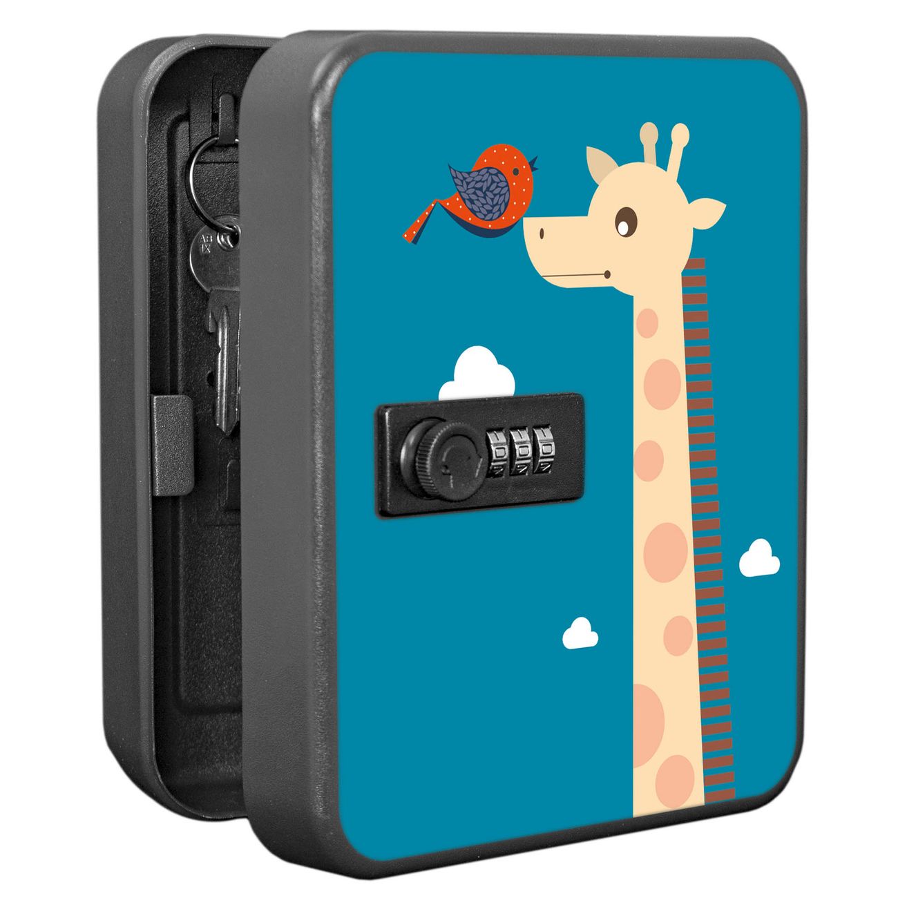 Der Schlüsselkasten ist gesamt 20x16x9,3cm groß und wiegt ca. 900g. Die komplette Schlüsselaufbewahrung besteht aus schwarzem pulverbeschichtetem Stahl und wird von uns auf der Front mit einer Motivfolie kaschiert.