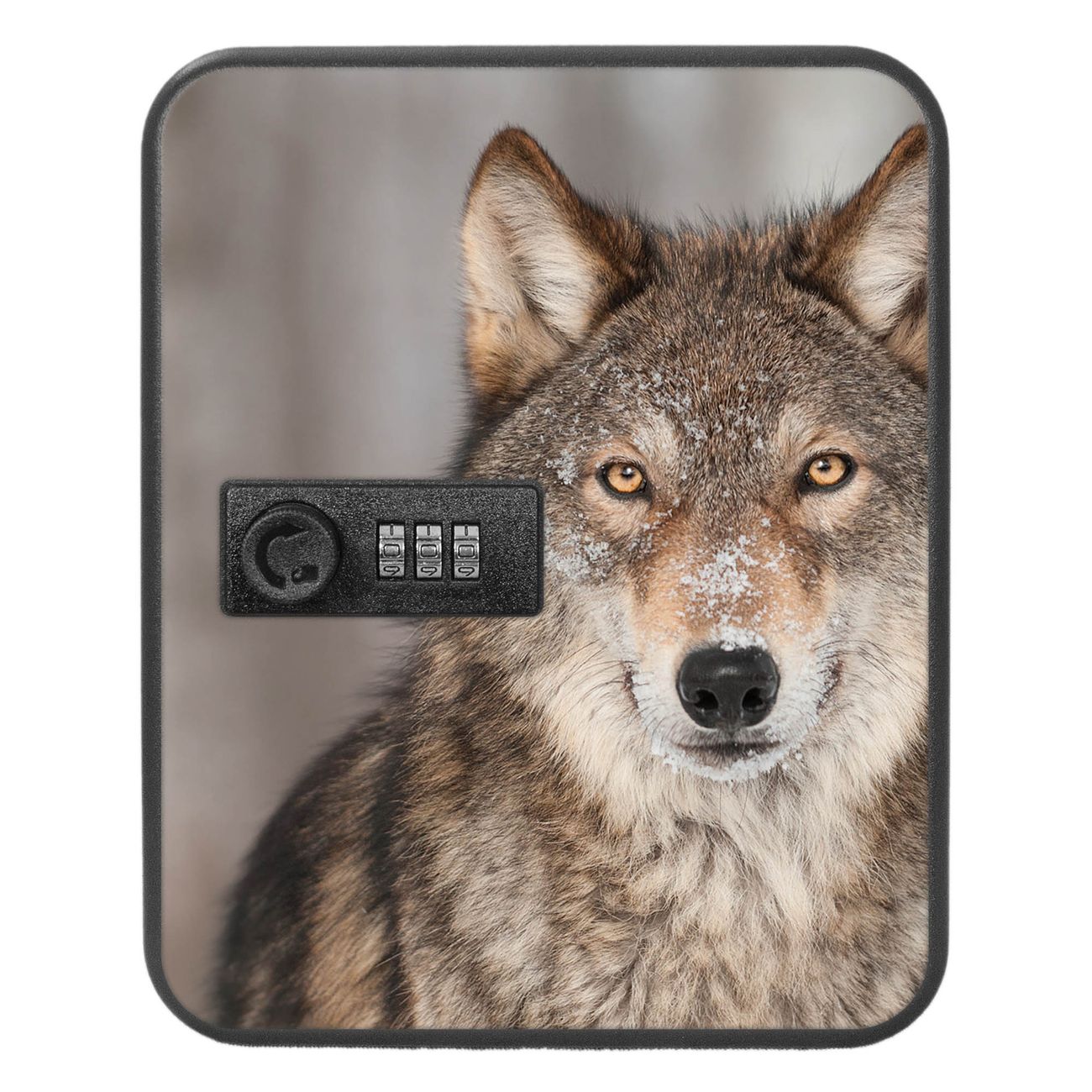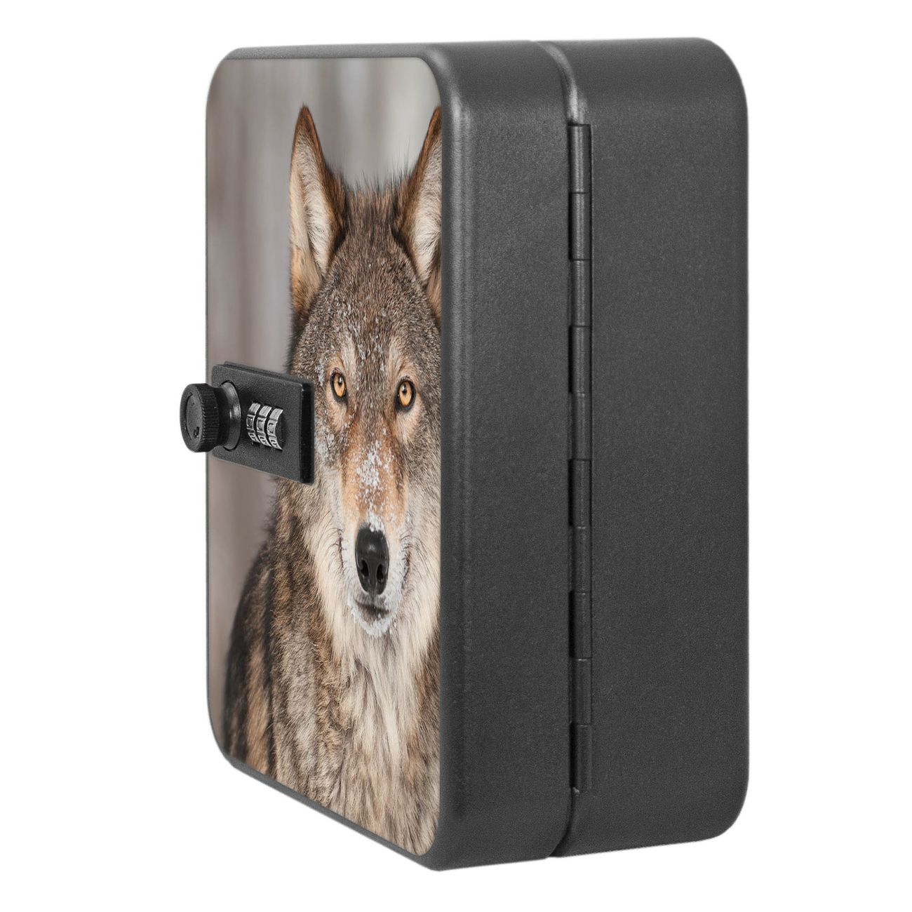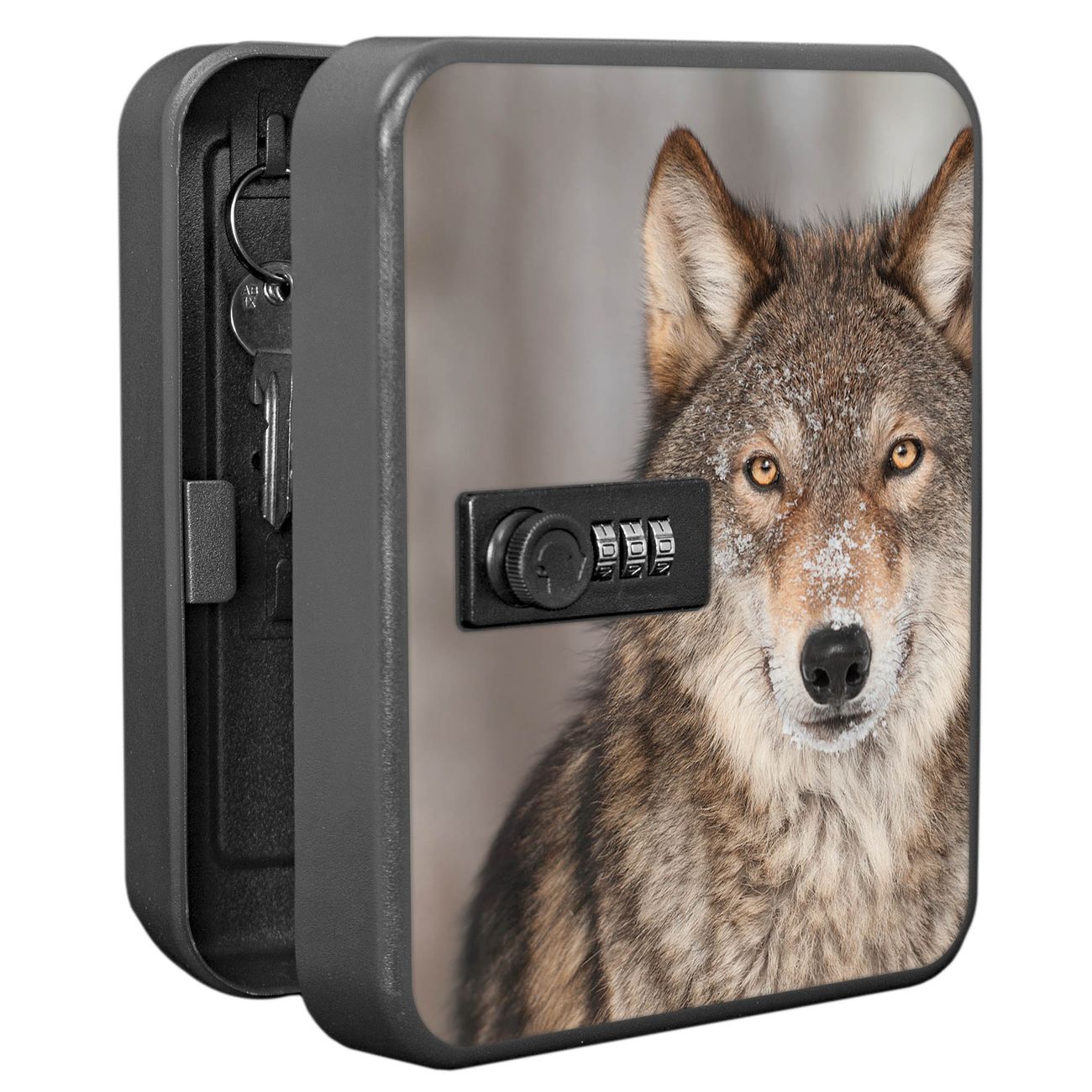 Der Schlüsselkasten ist gesamt 20x16x9,3cm groß und wiegt ca. 900g. Die komplette Schlüsselaufbewahrung besteht aus schwarzem pulverbeschichtetem Stahl und wird von uns auf der Front mit einer Motivfolie kaschiert.