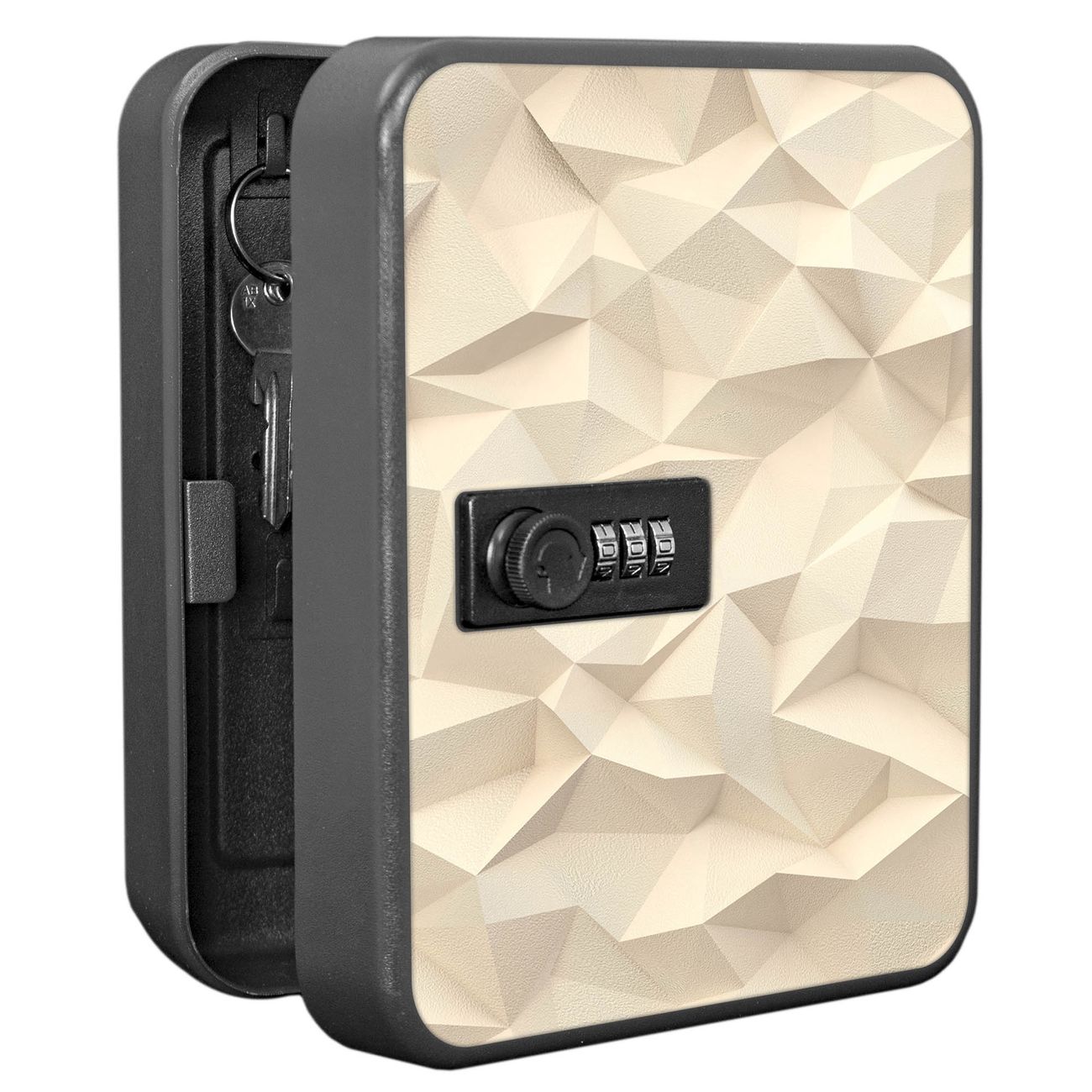 Der Schlüsselkasten ist gesamt 20x16x9,3cm groß und wiegt ca. 900g. Die komplette Schlüsselaufbewahrung besteht aus schwarzem pulverbeschichtetem Stahl und wird von uns auf der Front mit einer Motivfolie kaschiert.