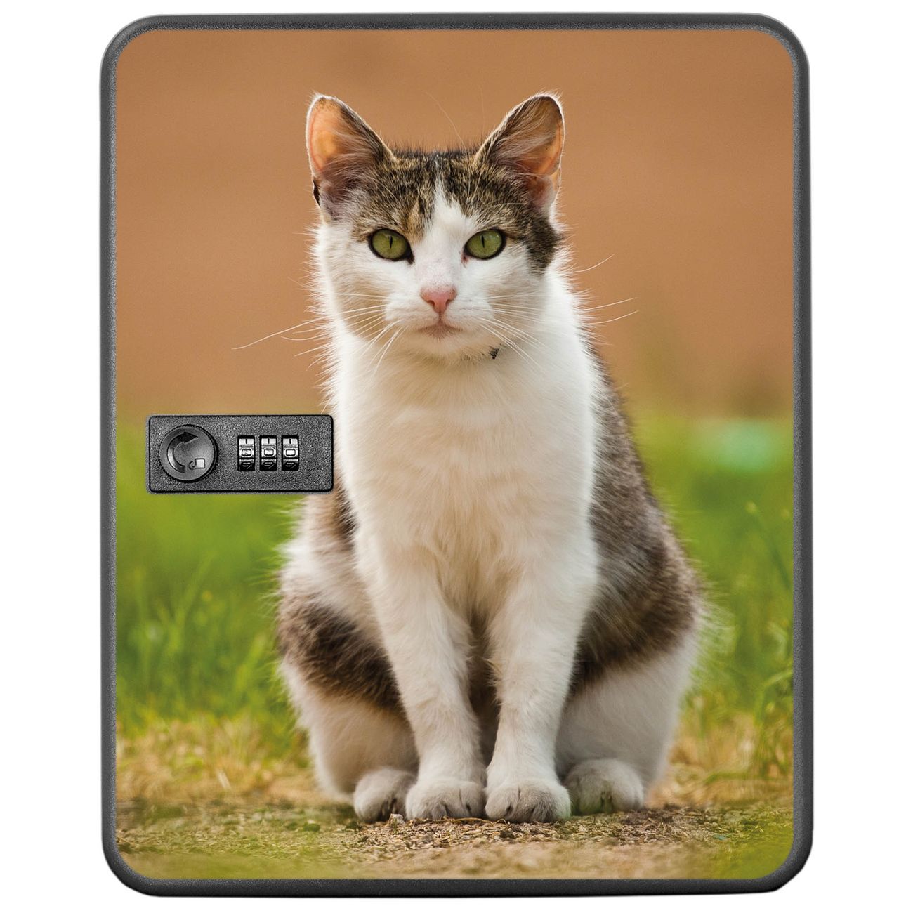 Der Schlüsselkasten ist gesamt 30x24x9,3cm groß und wiegt ca. 1500g. Die komplette Schlüsselaufbewahrung besteht aus schwarzem pulverbeschichtetem Stahl und wird von uns auf der Front mit einer Motivfolie kaschiert.