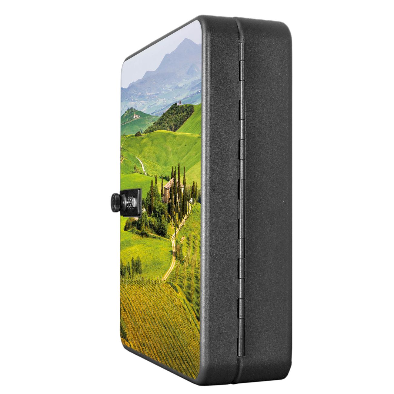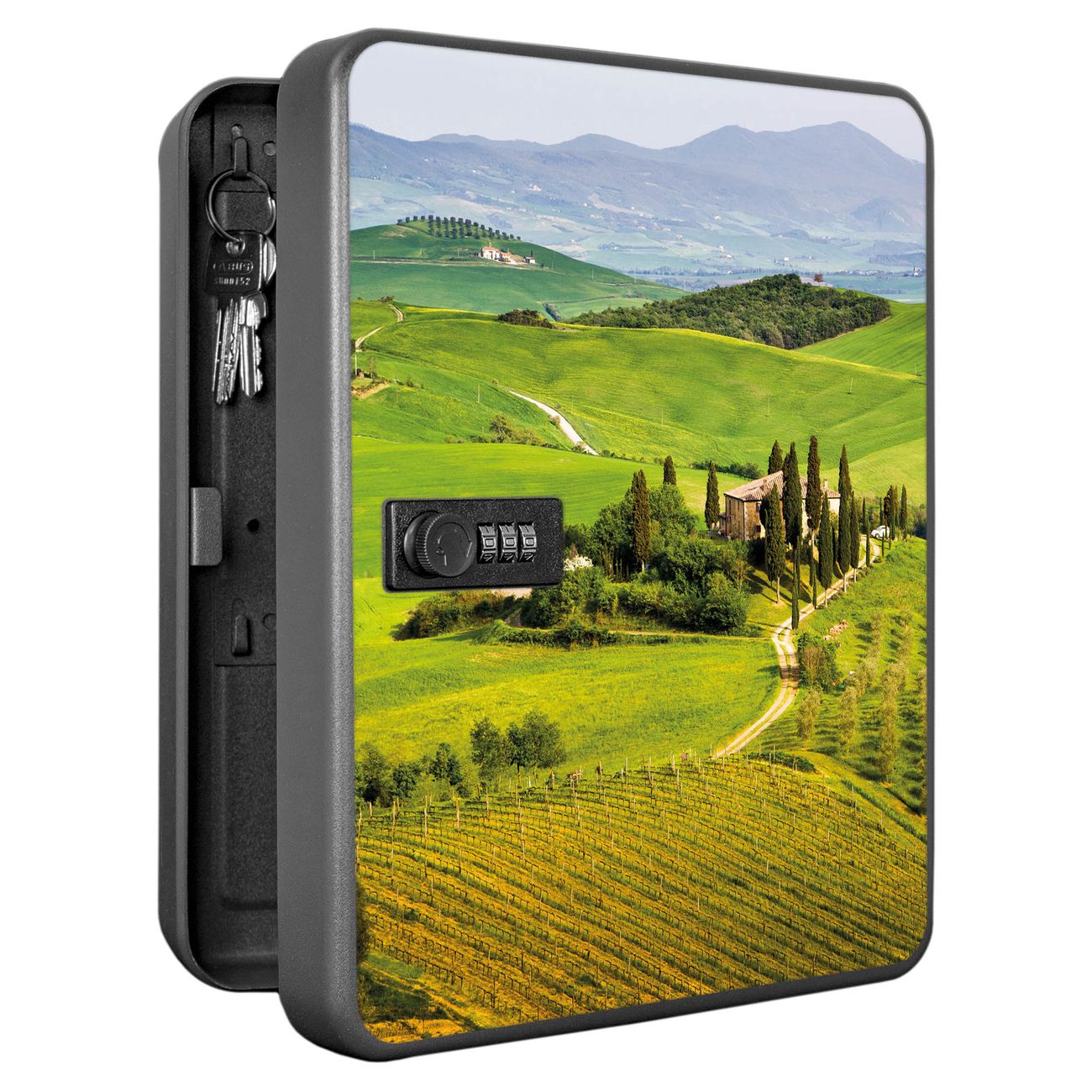 Der Schlüsselkasten ist gesamt 30x24x9,3cm groß und wiegt ca. 1500g. Die komplette Schlüsselaufbewahrung besteht aus schwarzem pulverbeschichtetem Stahl und wird von uns auf der Front mit einer Motivfolie kaschiert.