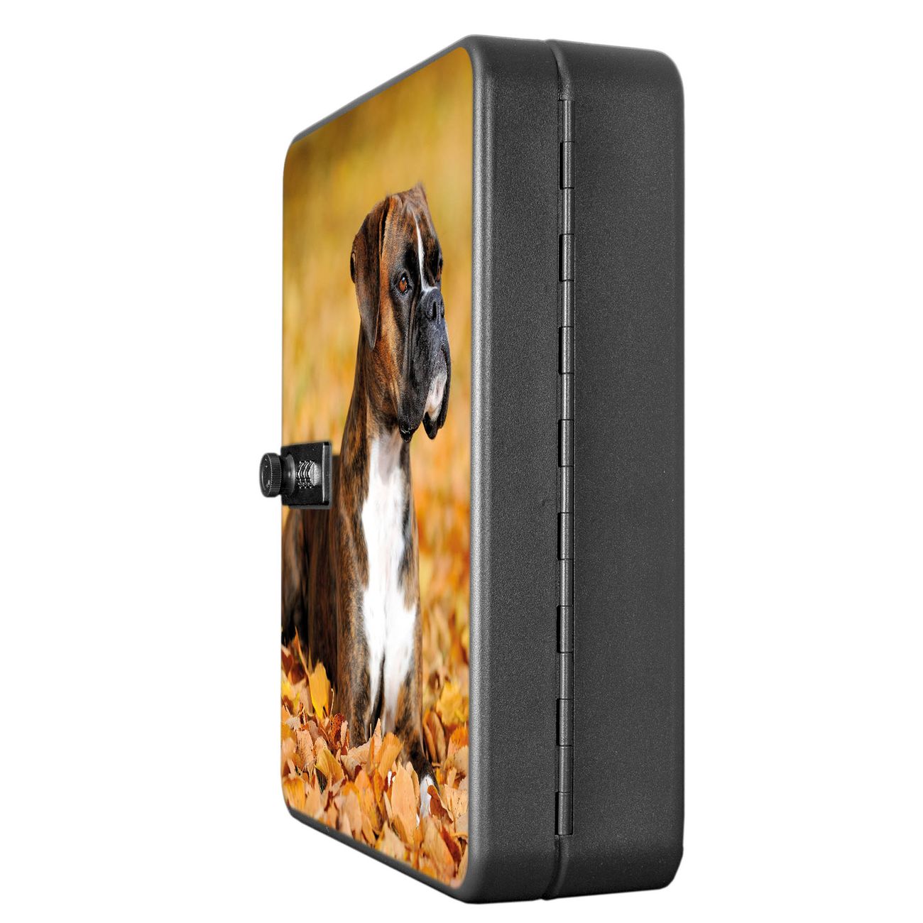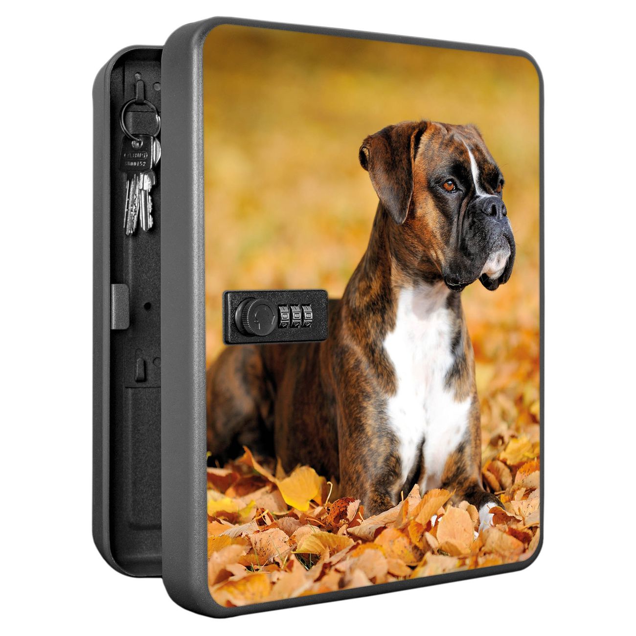 Der Schlüsselkasten ist gesamt 30x24x9,3cm groß und wiegt ca. 1500g. Die komplette Schlüsselaufbewahrung besteht aus schwarzem pulverbeschichtetem Stahl und wird von uns auf der Front mit einer Motivfolie kaschiert.
