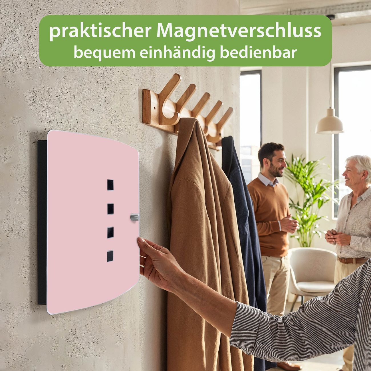 Funktion / Nutzen: Die leicht geschwungene Edelstahltür ist mit einer hochwertigen Motivfolie und dem Motiv Farbe Altrosa kaschiert. Ein praktischer Magnetverschluss ermöglicht Ihnen ein schnelles Öffnen und Schließen. Befestigt wird der Schlüsselkasten an 2 Stellen auf der Rückseite, passendes Montagematerial fügen wir bereits bei.