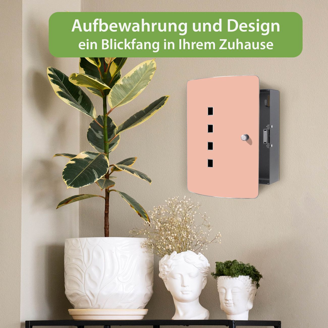 Funktion / Nutzen: Die leicht geschwungene Edelstahltür ist mit einer hochwertigen Motivfolie und dem Motiv Farbe Aprikot kaschiert. Ein praktischer Magnetverschluss ermöglicht Ihnen ein schnelles Öffnen und Schließen. Befestigt wird der Schlüsselkasten an 2 Stellen auf der Rückseite, passendes Montagematerial fügen wir bereits bei.