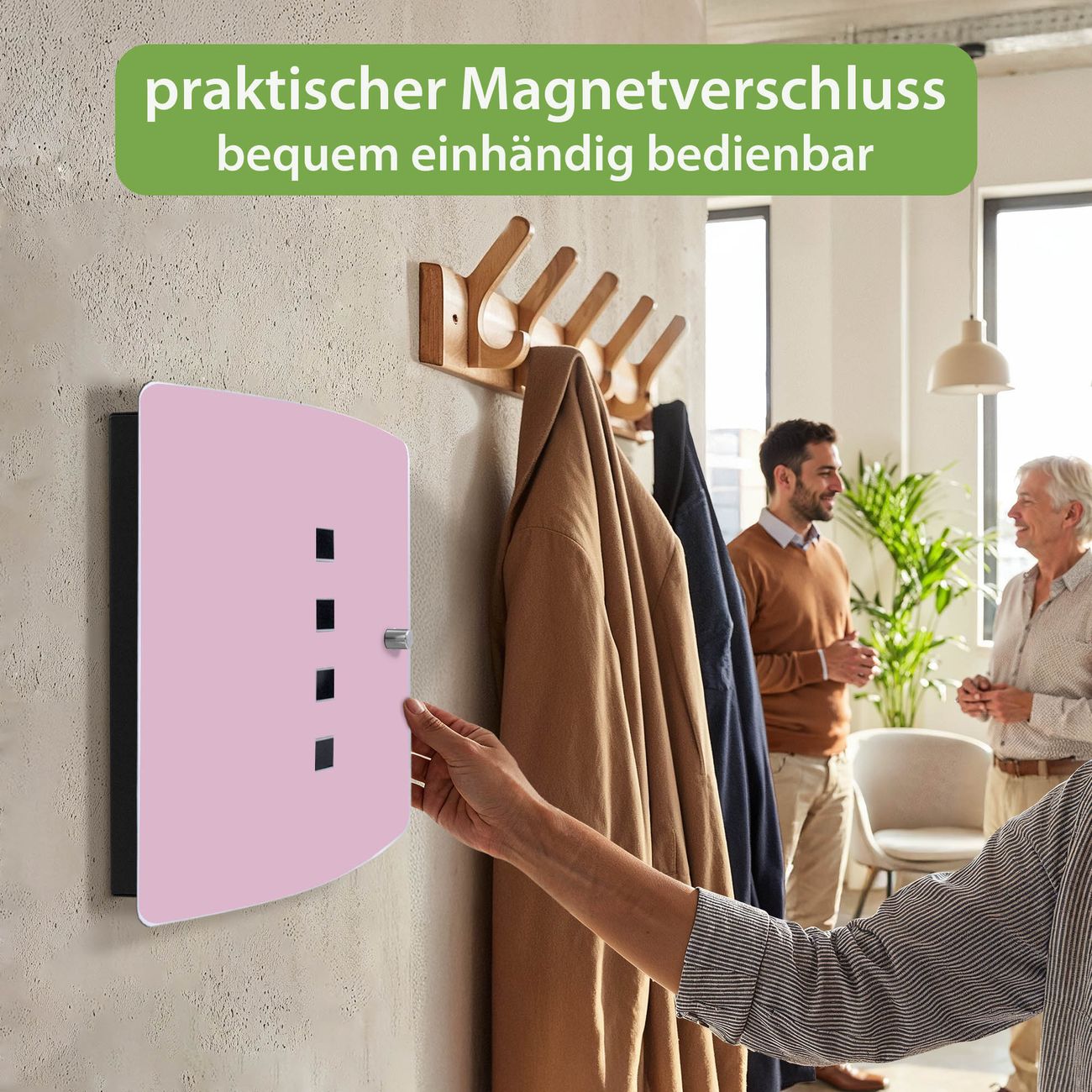 Funktion / Nutzen: Die leicht geschwungene Edelstahltür ist mit einer hochwertigen Motivfolie und dem Motiv Farbe Flieder kaschiert. Ein praktischer Magnetverschluss ermöglicht Ihnen ein schnelles Öffnen und Schließen. Befestigt wird der Schlüsselkasten an 2 Stellen auf der Rückseite, passendes Montagematerial fügen wir bereits bei.