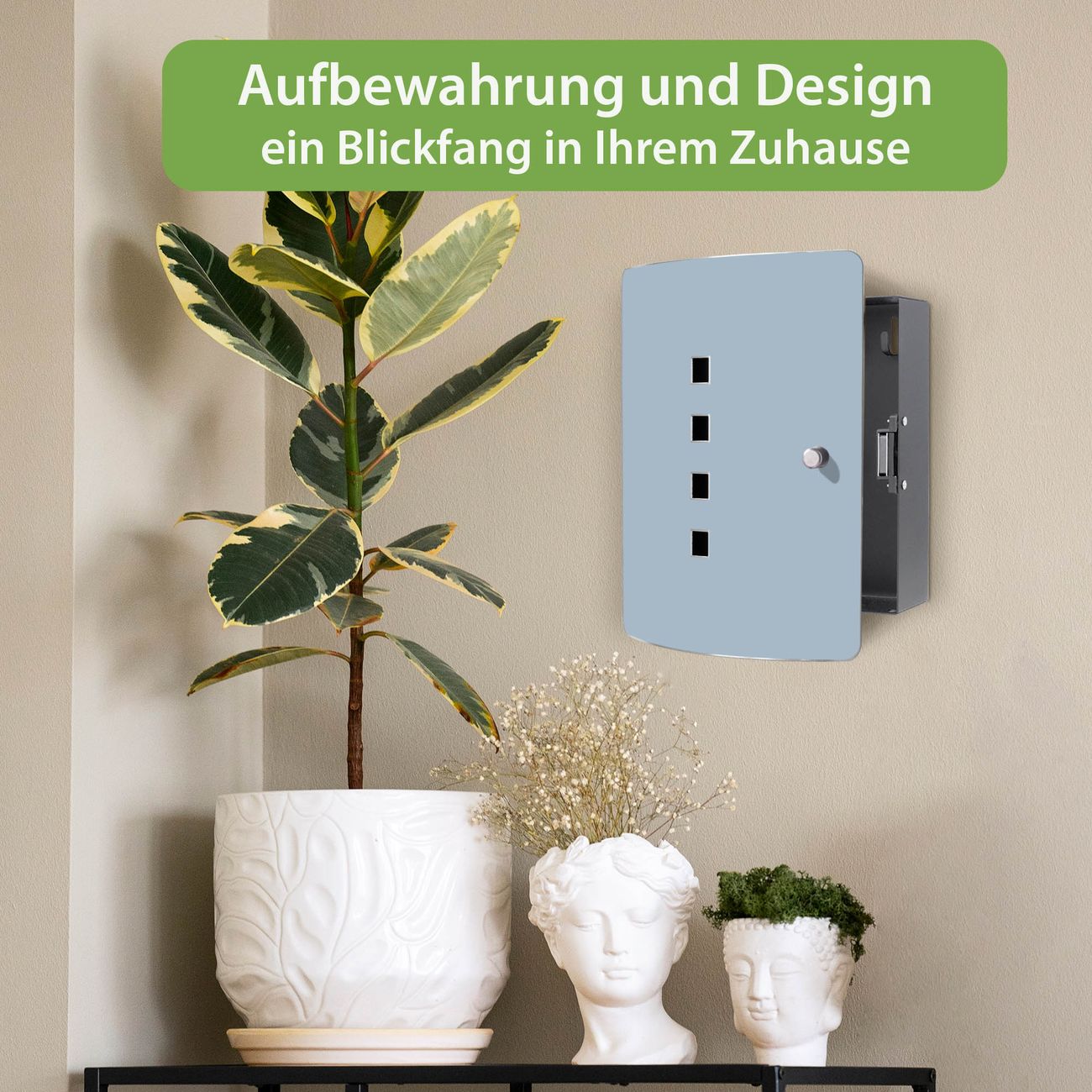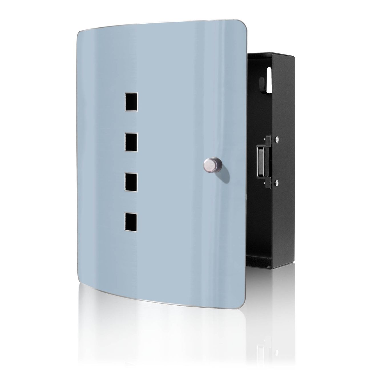 Funktion / Nutzen: Die leicht geschwungene Edelstahltür ist mit einer hochwertigen Motivfolie und dem Motiv Farbe Schieferblau kaschiert. Ein praktischer Magnetverschluss ermöglicht Ihnen ein schnelles Öffnen und Schließen. Befestigt wird der Schlüsselkasten an 2 Stellen auf der Rückseite, passendes Montagematerial fügen wir bereits bei.