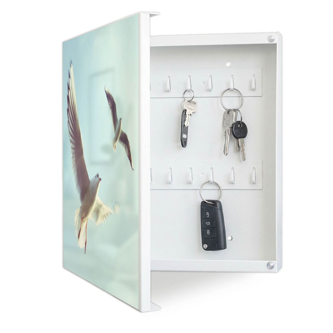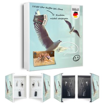 Bringe Ordnung und Eleganz in deinen Eingangsbereich mit dem banjado Schlüsselkasten Motiv Motiv 2 Möwen. Die moderne Schlüsselbox kombiniert funktionales Design mit hochwertiger Verarbeitung und wird so zu einem echten Hingucker in Flur, Büro oder Ferienwohnung. ✅ Stilvolle Schlüsselaufbewahrung mit Motiv Motiv 2 Möwen Der Design-Schlüsselkasten Motiv Motiv 2 Möwen bietet Platz für bis zu 32 Schlüssel, die auf 4 stabilen Reihen mit je 8 Haken übersichtlich verstaut werden. Mit seinen kompakten Maßen von 30 x 30 x 5 cm passt die Schlüsselbox perfekt auch in kleinere Räume. Der weiß lackierte Stahlkorpus mit links angeschlagenem Türscharnier harmoniert mit gedruckten Folie auf der Front und fügt sich nahtlos in jedes Wohnambiente ein. Ob als Schlüsselorganizer für Zuhause oder als praktische Lösung für Büros, Praxen und Gewerbe, der banjado Schlüsselkasten sorgt für Ordnung und Übersicht. Dank der magnetischen, mit Kreidestiften beschreibbaren Folie auf der Front kannst du Notizen anheften oder Termine direkt auf der Oberfläche festhalten. Die Schlüsselbox Motiv Motiv 2 Möwen zur Wandmontage wird inklusive Befestigungsmaterial geliefert und ist schnell angebracht. So hast du deine Schlüssel jederzeit griffbereit und zugleich stilvoll verstaut. Mit diesem banjado Schlüsselkasten Motiv Motiv 2 Möwen kombinierst du praktische Aufbewahrung mit stilvollem Wohndesign. Ob privat oder geschäftlich, die Schlüsselbox sorgt für mehr Ordnung, Übersicht und ein wohnliches Ambiente.Vorteile im Überblick