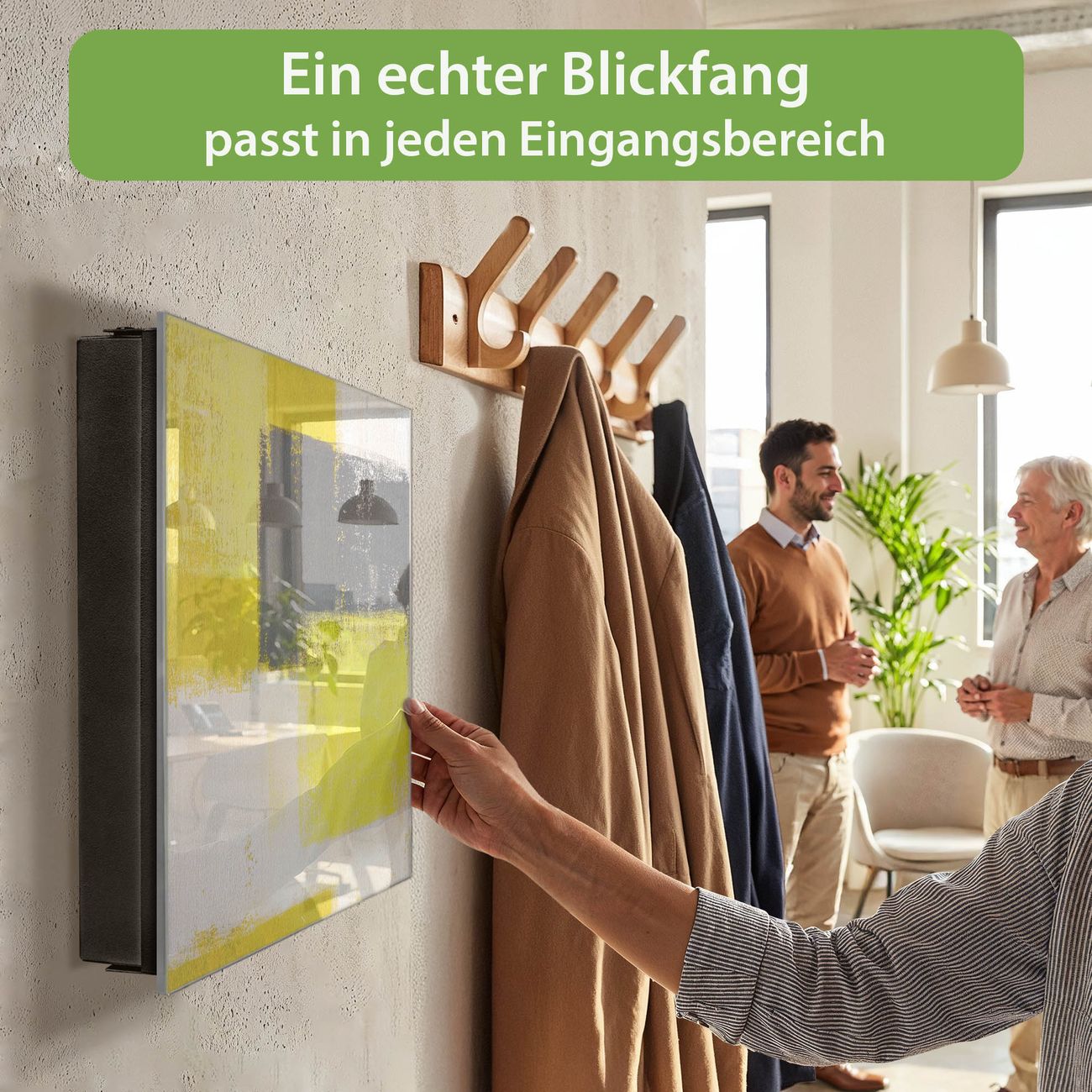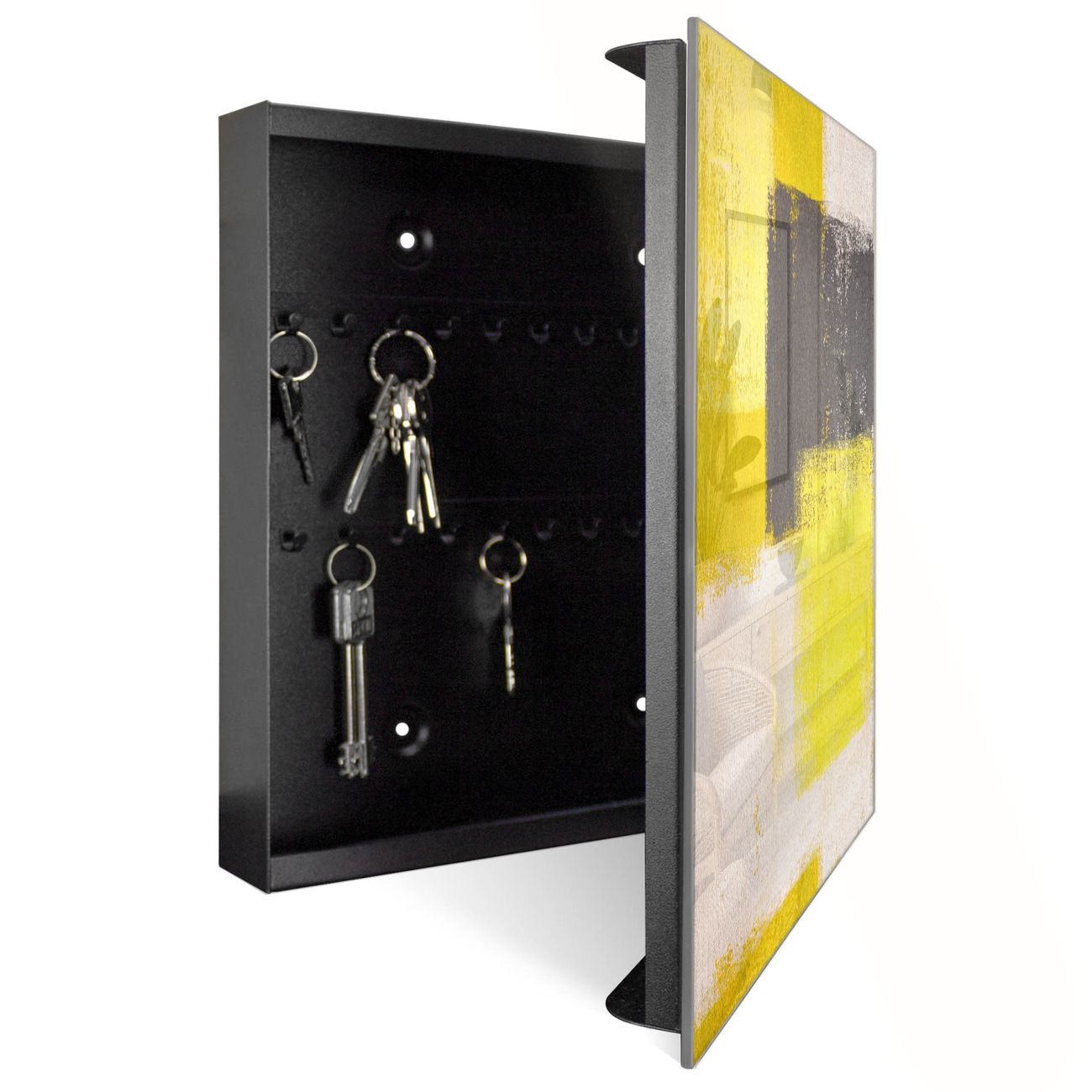 Bringe Ordnung und Eleganz in deinen Eingangsbereich mit dem banjado Schlüsselkasten Motiv Motiv Abstrakt Gelb. Die moderne Schlüsselbox kombiniert funktionales Design mit hochwertiger Verarbeitung und wird so zu einem echten Hingucker in Flur, Büro oder Ferienwohnung. ✅ Stilvolle Schlüsselaufbewahrung mit Glasfront im Motiv Motiv Abstrakt Gelb Der Design-Schlüsselkasten Motiv Motiv Abstrakt Gelb bietet Platz für bis zu 50 Schlüssel, die auf 5 stabilen Reihen mit je 10 Haken übersichtlich verstaut werden. Mit seinen kompakten Maßen von 30 x 30 x 5 cm passt die Schlüsselbox perfekt auch in kleinere Räume. Der schwarz lackierte Stahlkorpus mit rechts angeschlagenem Türscharnier harmoniert mit der Glasfront und fügt sich nahtlos in jedes Wohnambiente ein. Ob als Schlüsselorganizer für Zuhause oder als praktische Lösung für Büros, Praxen und Gewerbe, der banjado Schlüsselkasten sorgt für Ordnung und Übersicht. Dank der magnetischen, mit Kreidestiften beschreibbaren Glasfront kannst du Notizen anheften oder Termine direkt auf der Oberfläche festhalten. Die Schlüsselbox Motiv Motiv Abstrakt Gelb zur Wandmontage wird inklusive Befestigungsmaterial geliefert und ist schnell angebracht. So hast du deine Schlüssel jederzeit griffbereit und zugleich stilvoll verstaut. Mit diesem banjado Schlüsselkasten Motiv Motiv Abstrakt Gelb kombinierst du praktische Aufbewahrung mit stilvollem Wohndesign. Ob privat oder geschäftlich, die Schlüsselbox sorgt für mehr Ordnung, Übersicht und ein wohnliches Ambiente.Vorteile im Überblick