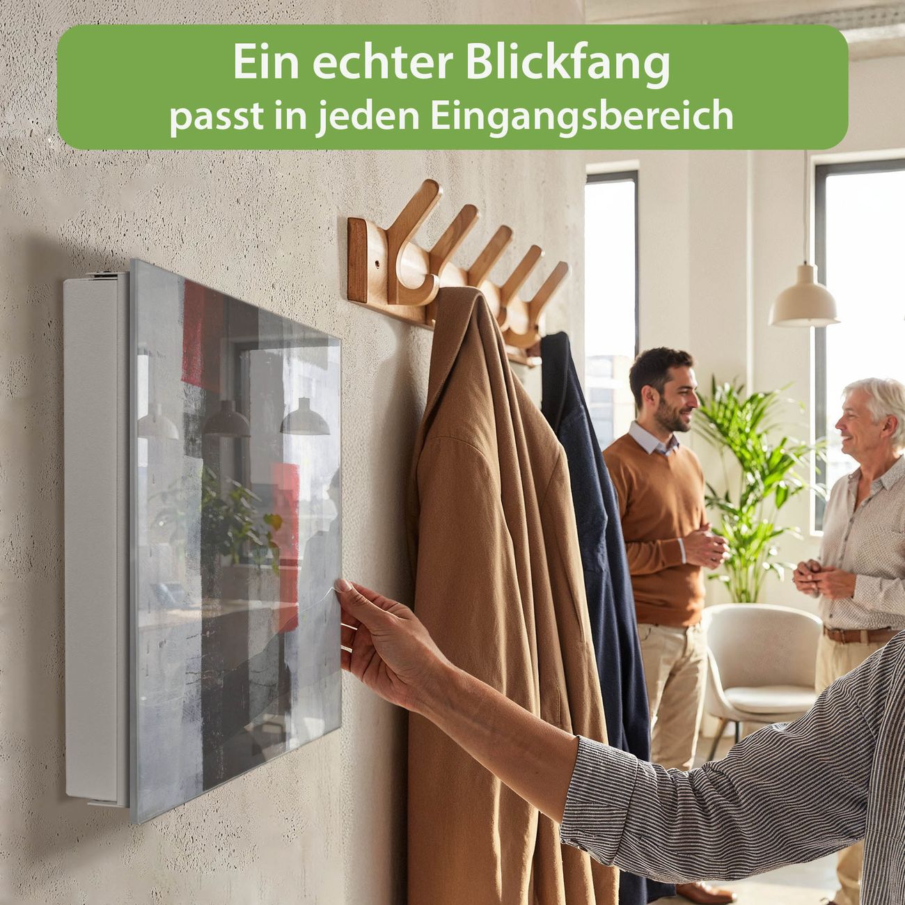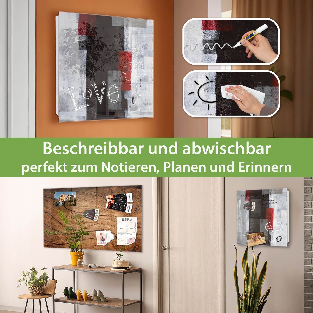 Bringe Ordnung und Eleganz in deinen Eingangsbereich mit dem banjado Schlüsselkasten Motiv Motiv Abstrakt Rot. Die moderne Schlüsselbox kombiniert funktionales Design mit hochwertiger Verarbeitung und wird so zu einem echten Hingucker in Flur, Büro oder Ferienwohnung. ✅ Stilvolle Schlüsselaufbewahrung mit Glasfront im Motiv Motiv Abstrakt Rot Der Design-Schlüsselkasten Motiv Motiv Abstrakt Rot bietet Platz für bis zu 50 Schlüssel, die auf 5 stabilen Reihen mit je 10 Haken übersichtlich verstaut werden. Mit seinen kompakten Maßen von 30 x 30 x 5 cm passt die Schlüsselbox perfekt auch in kleinere Räume. Der weiß lackierte Stahlkorpus mit rechts angeschlagenem Türscharnier harmoniert mit der Glasfront und fügt sich nahtlos in jedes Wohnambiente ein. Ob als Schlüsselorganizer für Zuhause oder als praktische Lösung für Büros, Praxen und Gewerbe, der banjado Schlüsselkasten sorgt für Ordnung und Übersicht. Dank der magnetischen, mit Kreidestiften beschreibbaren Glasfront kannst du Notizen anheften oder Termine direkt auf der Oberfläche festhalten. Die Schlüsselbox Motiv Motiv Abstrakt Rot zur Wandmontage wird inklusive Befestigungsmaterial geliefert und ist schnell angebracht. So hast du deine Schlüssel jederzeit griffbereit und zugleich stilvoll verstaut. Mit diesem banjado Schlüsselkasten Motiv Motiv Abstrakt Rot kombinierst du praktische Aufbewahrung mit stilvollem Wohndesign. Ob privat oder geschäftlich, die Schlüsselbox sorgt für mehr Ordnung, Übersicht und ein wohnliches Ambiente.Vorteile im Überblick