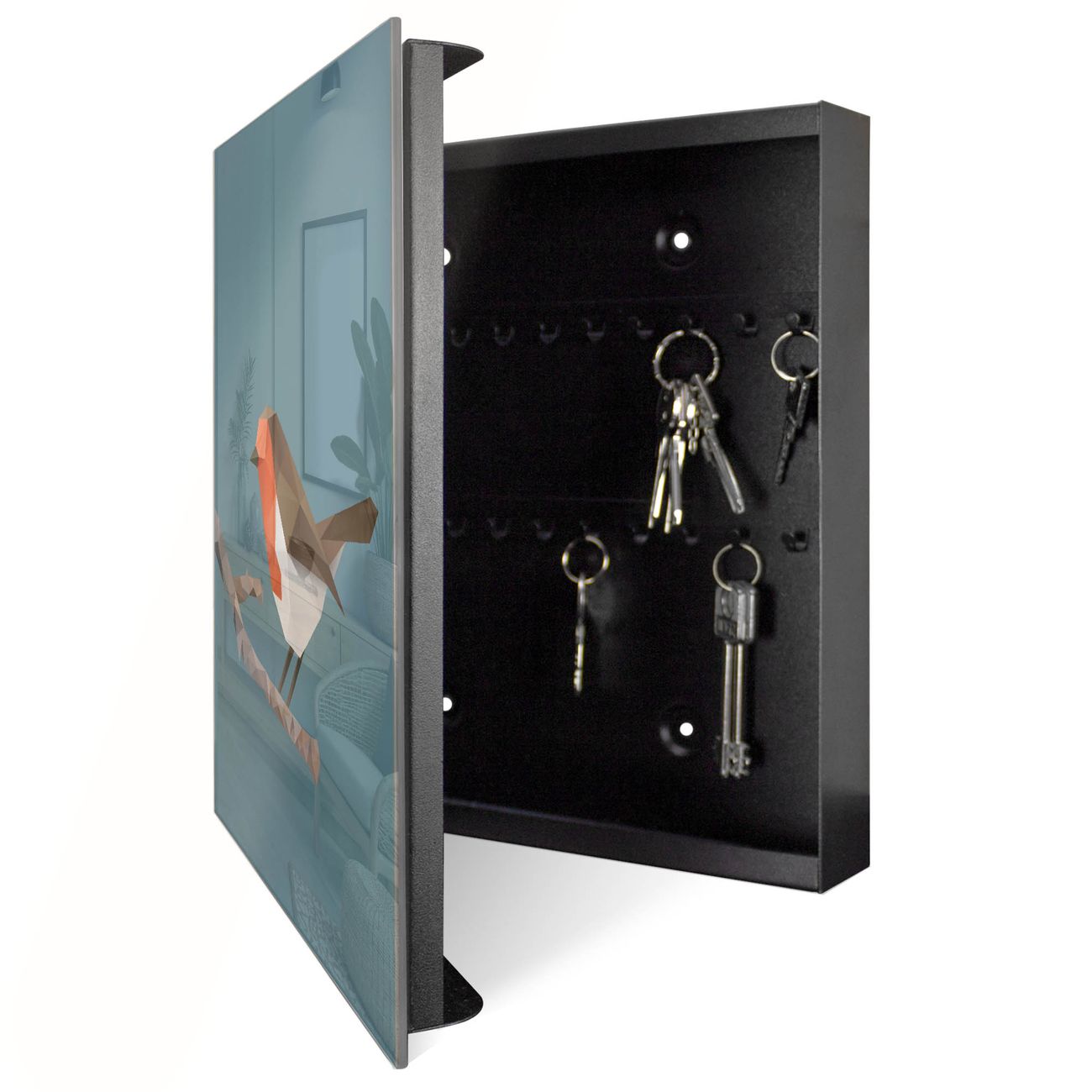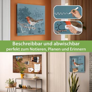Bringe Ordnung und Eleganz in deinen Eingangsbereich mit dem banjado Schlüsselkasten Motiv Motiv abstrakter Vogel. Die moderne Schlüsselbox kombiniert funktionales Design mit hochwertiger Verarbeitung und wird so zu einem echten Hingucker in Flur, Büro oder Ferienwohnung. ✅ Stilvolle Schlüsselaufbewahrung mit Glasfront im Motiv Motiv abstrakter Vogel Der Design-Schlüsselkasten Motiv Motiv abstrakter Vogel bietet Platz für bis zu 50 Schlüssel, die auf 5 stabilen Reihen mit je 10 Haken übersichtlich verstaut werden. Mit seinen kompakten Maßen von 30 x 30 x 5 cm passt die Schlüsselbox perfekt auch in kleinere Räume. Der schwarz lackierte Stahlkorpus mit rechts angeschlagenem Türscharnier harmoniert mit der Glasfront und fügt sich nahtlos in jedes Wohnambiente ein. Ob als Schlüsselorganizer für Zuhause oder als praktische Lösung für Büros, Praxen und Gewerbe, der banjado Schlüsselkasten sorgt für Ordnung und Übersicht. Dank der magnetischen, mit Kreidestiften beschreibbaren Glasfront kannst du Notizen anheften oder Termine direkt auf der Oberfläche festhalten. Die Schlüsselbox Motiv Motiv abstrakter Vogel zur Wandmontage wird inklusive Befestigungsmaterial geliefert und ist schnell angebracht. So hast du deine Schlüssel jederzeit griffbereit und zugleich stilvoll verstaut. Mit diesem banjado Schlüsselkasten Motiv Motiv abstrakter Vogel kombinierst du praktische Aufbewahrung mit stilvollem Wohndesign. Ob privat oder geschäftlich, die Schlüsselbox sorgt für mehr Ordnung, Übersicht und ein wohnliches Ambiente.Vorteile im Überblick