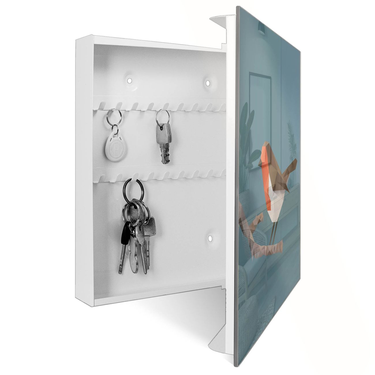 Bringe Ordnung und Eleganz in deinen Eingangsbereich mit dem banjado Schlüsselkasten Motiv Motiv abstrakter Vogel. Die moderne Schlüsselbox kombiniert funktionales Design mit hochwertiger Verarbeitung und wird so zu einem echten Hingucker in Flur, Büro oder Ferienwohnung. ✅ Stilvolle Schlüsselaufbewahrung mit Glasfront im Motiv Motiv abstrakter Vogel Der Design-Schlüsselkasten Motiv Motiv abstrakter Vogel bietet Platz für bis zu 50 Schlüssel, die auf 5 stabilen Reihen mit je 10 Haken übersichtlich verstaut werden. Mit seinen kompakten Maßen von 30 x 30 x 5 cm passt die Schlüsselbox perfekt auch in kleinere Räume. Der weiß lackierte Stahlkorpus mit rechts angeschlagenem Türscharnier harmoniert mit der Glasfront und fügt sich nahtlos in jedes Wohnambiente ein. Ob als Schlüsselorganizer für Zuhause oder als praktische Lösung für Büros, Praxen und Gewerbe, der banjado Schlüsselkasten sorgt für Ordnung und Übersicht. Dank der magnetischen, mit Kreidestiften beschreibbaren Glasfront kannst du Notizen anheften oder Termine direkt auf der Oberfläche festhalten. Die Schlüsselbox Motiv Motiv abstrakter Vogel zur Wandmontage wird inklusive Befestigungsmaterial geliefert und ist schnell angebracht. So hast du deine Schlüssel jederzeit griffbereit und zugleich stilvoll verstaut. Mit diesem banjado Schlüsselkasten Motiv Motiv abstrakter Vogel kombinierst du praktische Aufbewahrung mit stilvollem Wohndesign. Ob privat oder geschäftlich, die Schlüsselbox sorgt für mehr Ordnung, Übersicht und ein wohnliches Ambiente.Vorteile im Überblick