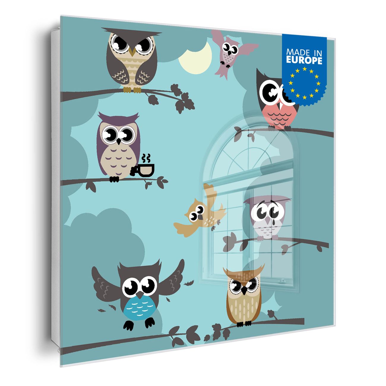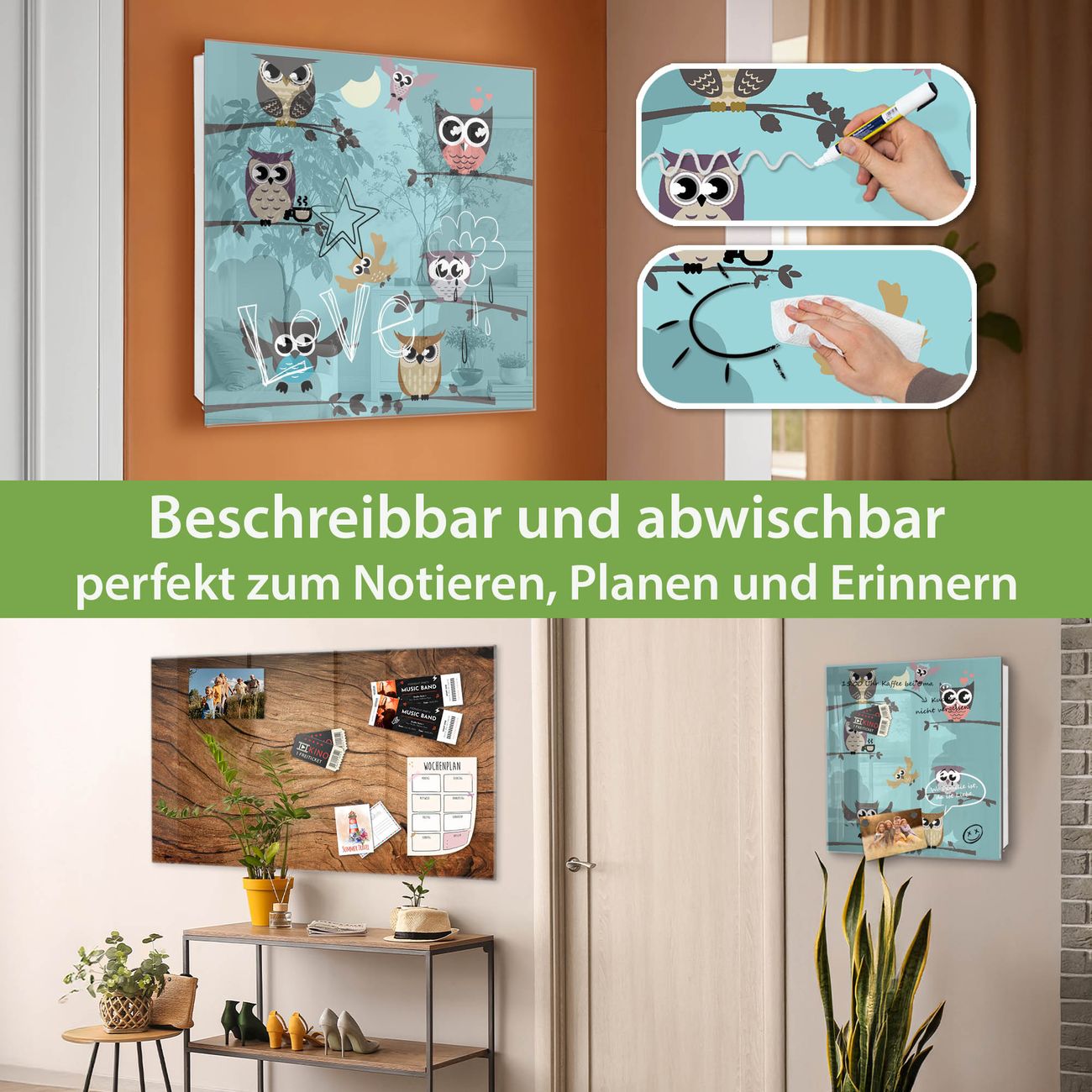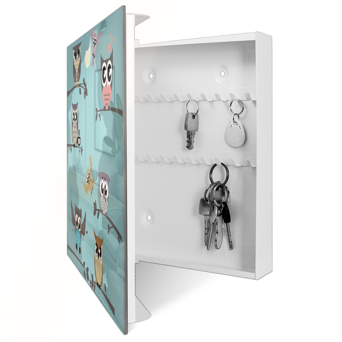 Bringe Ordnung und Eleganz in deinen Eingangsbereich mit dem banjado Schlüsselkasten Motiv Motiv Acht Eulen. Die moderne Schlüsselbox kombiniert funktionales Design mit hochwertiger Verarbeitung und wird so zu einem echten Hingucker in Flur, Büro oder Ferienwohnung. ✅ Stilvolle Schlüsselaufbewahrung mit Glasfront im Motiv Motiv Acht Eulen Der Design-Schlüsselkasten Motiv Motiv Acht Eulen bietet Platz für bis zu 50 Schlüssel, die auf 5 stabilen Reihen mit je 10 Haken übersichtlich verstaut werden. Mit seinen kompakten Maßen von 30 x 30 x 5 cm passt die Schlüsselbox perfekt auch in kleinere Räume. Der weiß lackierte Stahlkorpus mit rechts angeschlagenem Türscharnier harmoniert mit der Glasfront und fügt sich nahtlos in jedes Wohnambiente ein. Ob als Schlüsselorganizer für Zuhause oder als praktische Lösung für Büros, Praxen und Gewerbe, der banjado Schlüsselkasten sorgt für Ordnung und Übersicht. Dank der magnetischen, mit Kreidestiften beschreibbaren Glasfront kannst du Notizen anheften oder Termine direkt auf der Oberfläche festhalten. Die Schlüsselbox Motiv Motiv Acht Eulen zur Wandmontage wird inklusive Befestigungsmaterial geliefert und ist schnell angebracht. So hast du deine Schlüssel jederzeit griffbereit und zugleich stilvoll verstaut. Mit diesem banjado Schlüsselkasten Motiv Motiv Acht Eulen kombinierst du praktische Aufbewahrung mit stilvollem Wohndesign. Ob privat oder geschäftlich, die Schlüsselbox sorgt für mehr Ordnung, Übersicht und ein wohnliches Ambiente.Vorteile im Überblick