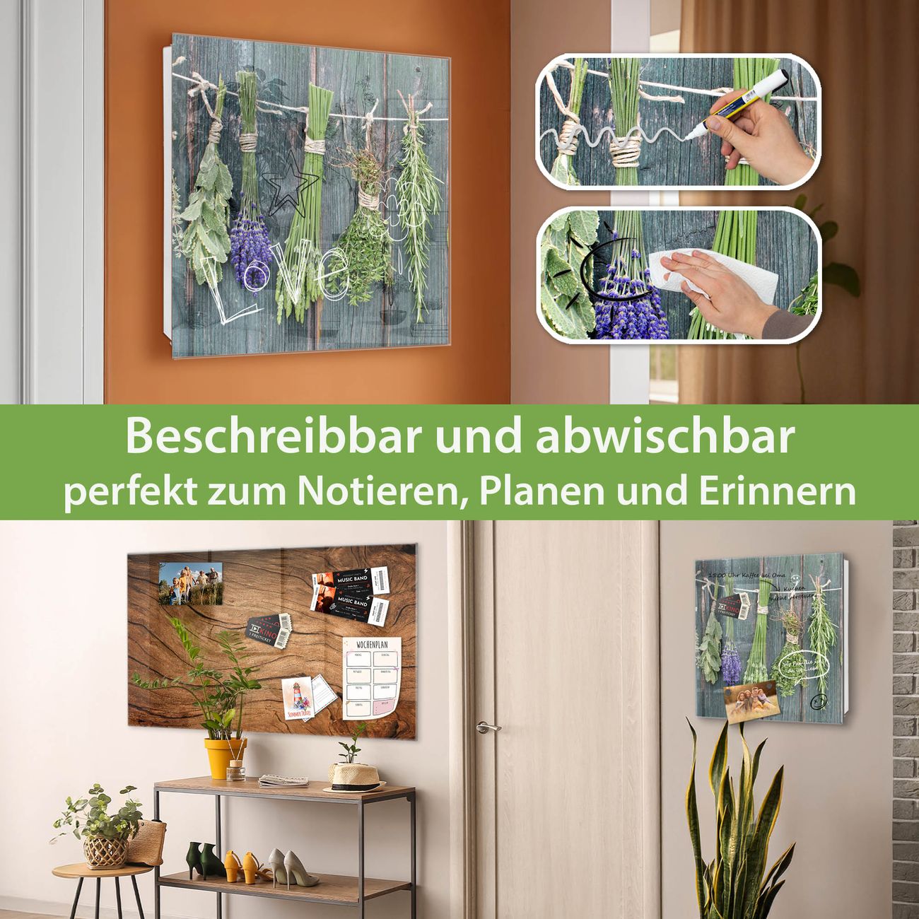 Bringe Ordnung und Eleganz in deinen Eingangsbereich mit dem banjado Schlüsselkasten Motiv Motiv Acht Kräuter. Die moderne Schlüsselbox kombiniert funktionales Design mit hochwertiger Verarbeitung und wird so zu einem echten Hingucker in Flur, Büro oder Ferienwohnung. ✅ Stilvolle Schlüsselaufbewahrung mit Glasfront im Motiv Motiv Acht Kräuter Der Design-Schlüsselkasten Motiv Motiv Acht Kräuter bietet Platz für bis zu 50 Schlüssel, die auf 5 stabilen Reihen mit je 10 Haken übersichtlich verstaut werden. Mit seinen kompakten Maßen von 30 x 30 x 5 cm passt die Schlüsselbox perfekt auch in kleinere Räume. Der weiß lackierte Stahlkorpus mit rechts angeschlagenem Türscharnier harmoniert mit der Glasfront und fügt sich nahtlos in jedes Wohnambiente ein. Ob als Schlüsselorganizer für Zuhause oder als praktische Lösung für Büros, Praxen und Gewerbe, der banjado Schlüsselkasten sorgt für Ordnung und Übersicht. Dank der magnetischen, mit Kreidestiften beschreibbaren Glasfront kannst du Notizen anheften oder Termine direkt auf der Oberfläche festhalten. Die Schlüsselbox Motiv Motiv Acht Kräuter zur Wandmontage wird inklusive Befestigungsmaterial geliefert und ist schnell angebracht. So hast du deine Schlüssel jederzeit griffbereit und zugleich stilvoll verstaut. Mit diesem banjado Schlüsselkasten Motiv Motiv Acht Kräuter kombinierst du praktische Aufbewahrung mit stilvollem Wohndesign. Ob privat oder geschäftlich, die Schlüsselbox sorgt für mehr Ordnung, Übersicht und ein wohnliches Ambiente.Vorteile im Überblick