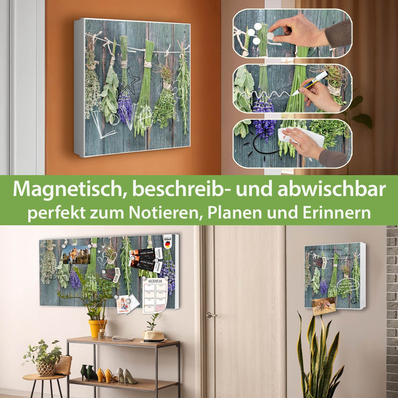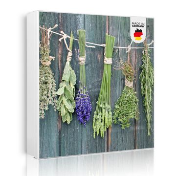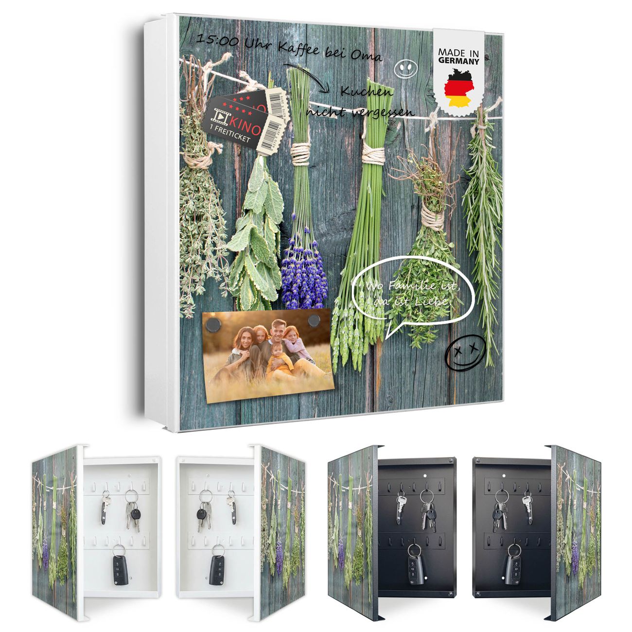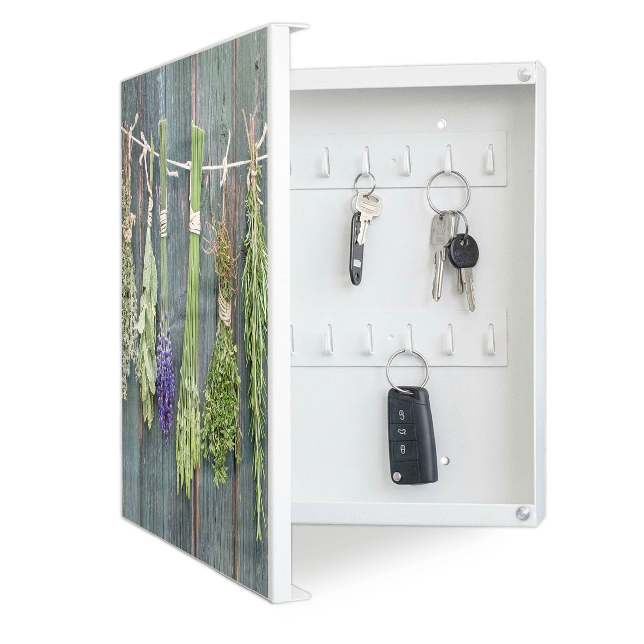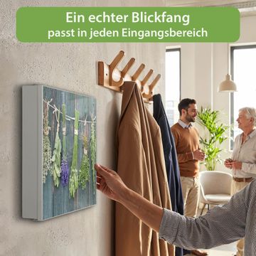 Bringe Ordnung und Eleganz in deinen Eingangsbereich mit dem banjado Schlüsselkasten Motiv Motiv Acht Kräuter. Die moderne Schlüsselbox kombiniert funktionales Design mit hochwertiger Verarbeitung und wird so zu einem echten Hingucker in Flur, Büro oder Ferienwohnung. ✅ Stilvolle Schlüsselaufbewahrung mit Motiv Motiv Acht Kräuter Der Design-Schlüsselkasten Motiv Motiv Acht Kräuter bietet Platz für bis zu 32 Schlüssel, die auf 4 stabilen Reihen mit je 8 Haken übersichtlich verstaut werden. Mit seinen kompakten Maßen von 30 x 30 x 5 cm passt die Schlüsselbox perfekt auch in kleinere Räume. Der weiß lackierte Stahlkorpus mit links angeschlagenem Türscharnier harmoniert mit gedruckten Folie auf der Front und fügt sich nahtlos in jedes Wohnambiente ein. Ob als Schlüsselorganizer für Zuhause oder als praktische Lösung für Büros, Praxen und Gewerbe, der banjado Schlüsselkasten sorgt für Ordnung und Übersicht. Dank der magnetischen, mit Kreidestiften beschreibbaren Folie auf der Front kannst du Notizen anheften oder Termine direkt auf der Oberfläche festhalten. Die Schlüsselbox Motiv Motiv Acht Kräuter zur Wandmontage wird inklusive Befestigungsmaterial geliefert und ist schnell angebracht. So hast du deine Schlüssel jederzeit griffbereit und zugleich stilvoll verstaut. Mit diesem banjado Schlüsselkasten Motiv Motiv Acht Kräuter kombinierst du praktische Aufbewahrung mit stilvollem Wohndesign. Ob privat oder geschäftlich, die Schlüsselbox sorgt für mehr Ordnung, Übersicht und ein wohnliches Ambiente.Vorteile im Überblick